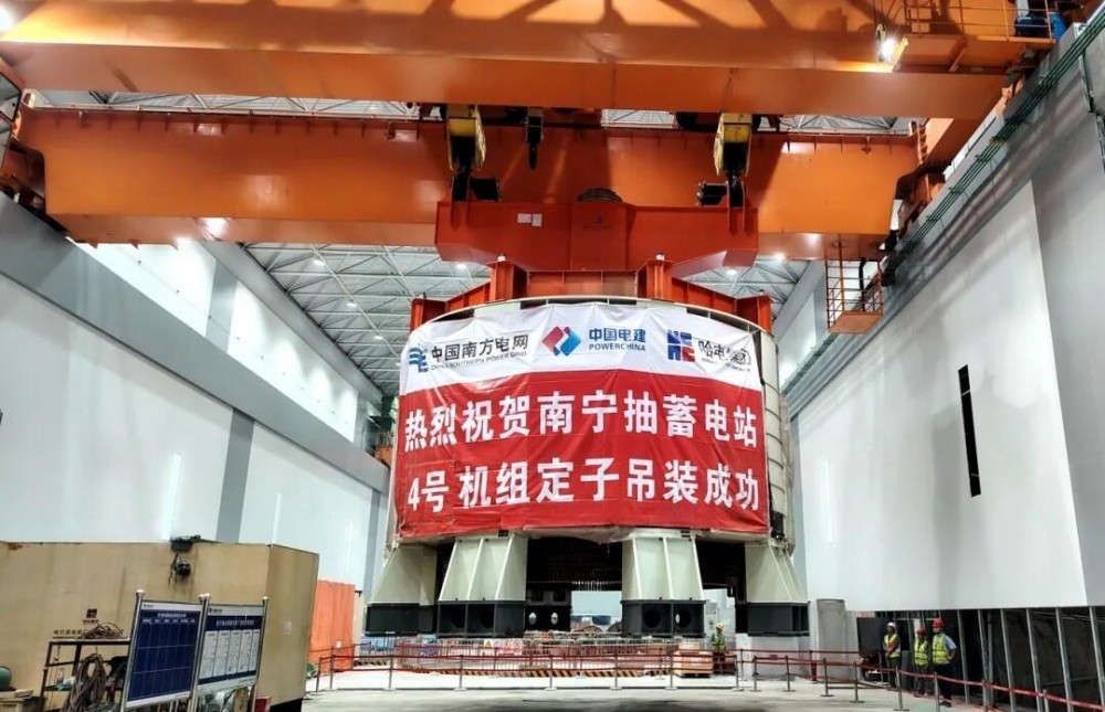近日,南网储能广西南宁抽水蓄能电站最后一台机组4号机组定子顺利完成吊装,标志着该项目机电设备安装工程进入全面冲刺阶段。