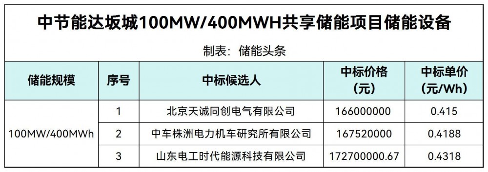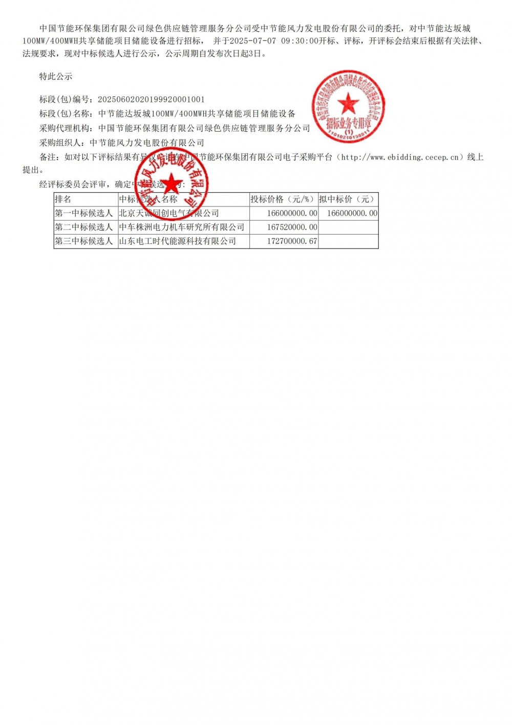 第一中标候选人为北京天诚同创电气有限公司,投标报价166000000元,折合单价0.415元/wh;第二中标候选人为中车株洲电力机车研究所有限公司,投标报价167520000元,折合单价0.4188元/wh;第三中标候选人为山东电工时代能源科技有限公司,投标报价172700000.67元,折合单价0.4318元/wh。