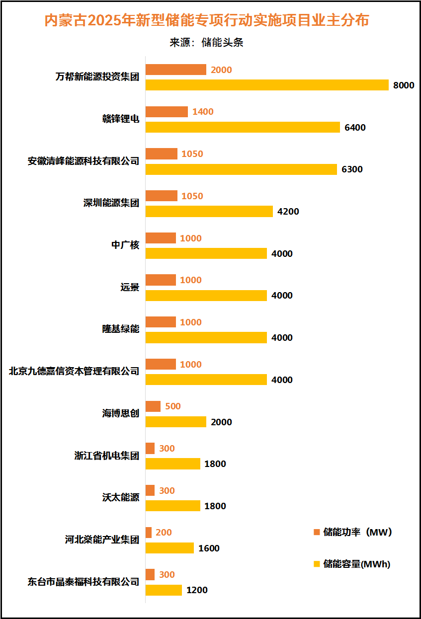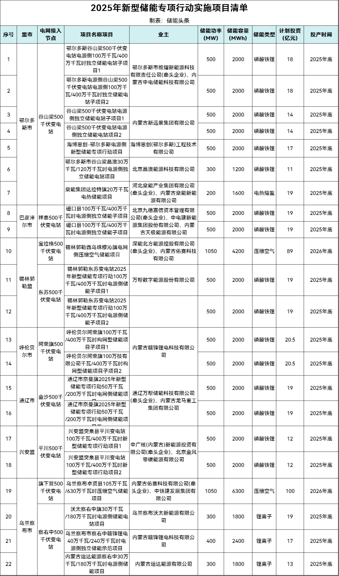 3月,内蒙古自治区能源局印发《2025年新型储能专项行动实施项目清单的通知》。根据通知,共计22个项目纳入自治区2025年新型储能专项行动实施项目清单,装机容量1110万千瓦/4930万千瓦时,单个项目规模均在gwh级。