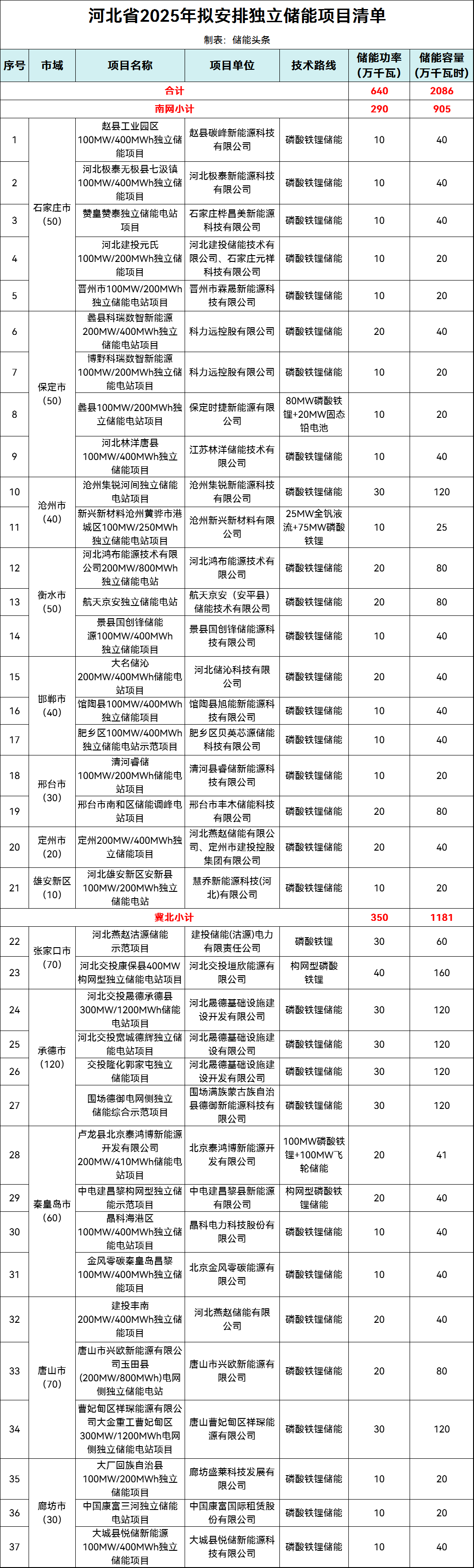 2月12日,河北发改委发布河北省2025年拟安排独立储能项目情况公示,本次公示项目共37个、6.4gw/20.86gwh。其中4小时项目共23个,2小时项目14个。