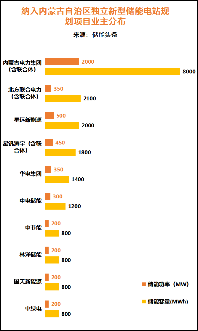 投资集团(含合作开发)、内蒙古电力集团(含合作开发)、赣锋锂电规模最大,分别为2gw/8gwh、2gw/8gwh、1.4gw/6.4gwh。此外清峰能源、中广核、深圳能源集团、远景、隆基绿能、北京九德嘉信资本管理有限公司也均独立开发了4000mwh的储能项目。