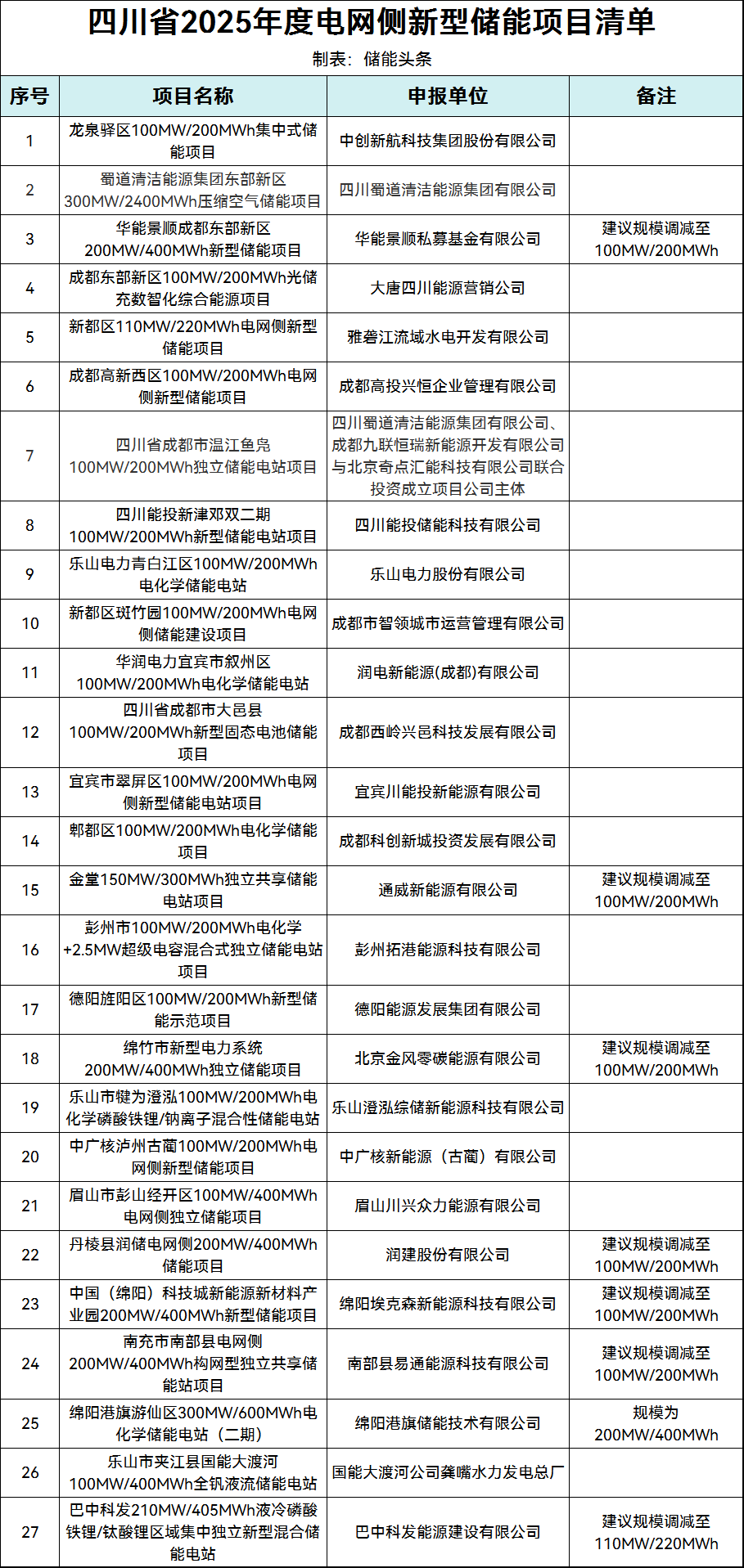 5月21日,四川省发改委发布《关于2025年度拟纳入电网侧新型储能项目清单的公示》。据项目清单,27个项目总规模3.77gw/9.725gwh。其中9个项目建议调减规模,调减后,27个项目总规模为3.02gw/8.24gwh。
