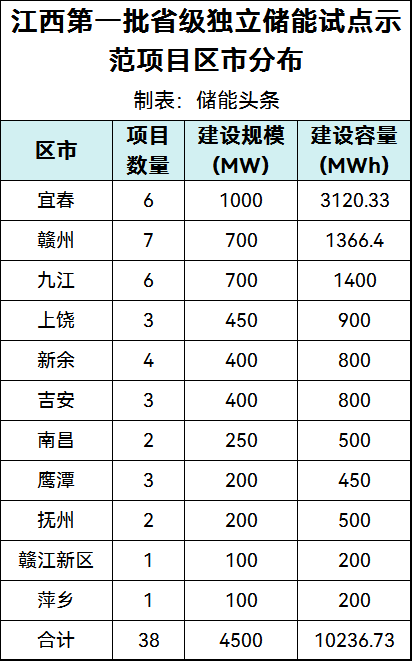 38个独立储能项目将于江西省内11区市建设,其中宜春申报规模最大为1000mw,其次是赣州、九江为700mw,上饶4500mw,新余、吉安均为400mw。