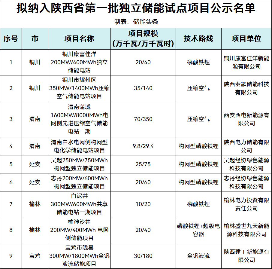2024年12月30日,陕西省发展和改革委员会发布关于陕西省第一批独立储能试点项目遴选结果的公示,该批次项目总计9个,储能总规模为2.398gw/9.344gwh。