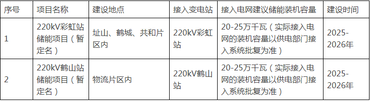 其中,220kv彩虹站储能项目规划储能装机容量20-25万千瓦;220kv鹤山站储能项目规划储能装机容量20-25万千瓦。