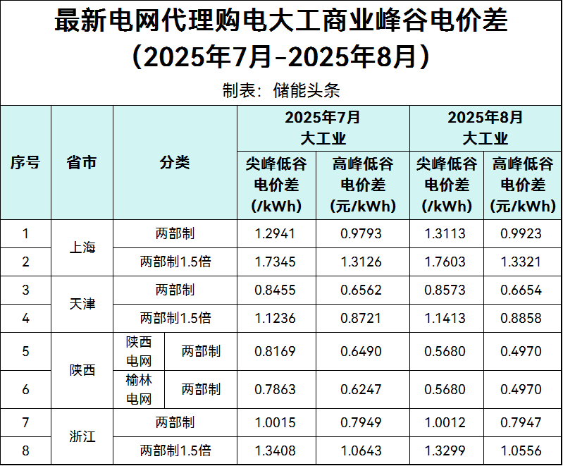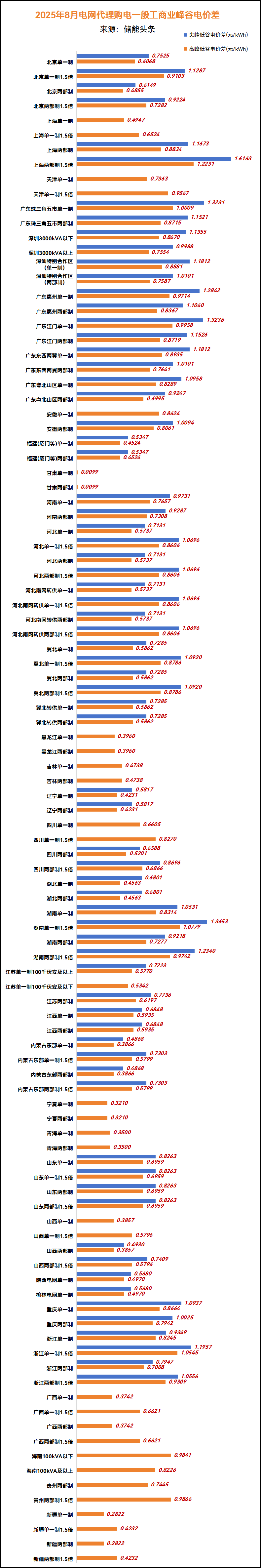 能源圈了解到,2025年8月电网代购电价格中,全国峰谷价差最高的是上海,执行大工商业两部制1.5倍尖峰电价时,峰谷价差为1.7603元/kwh。