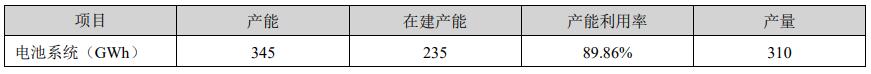 宁德时代电池系统产能345gwh,在建产能235gwh,产能利用率89.86%,产量310gwh。