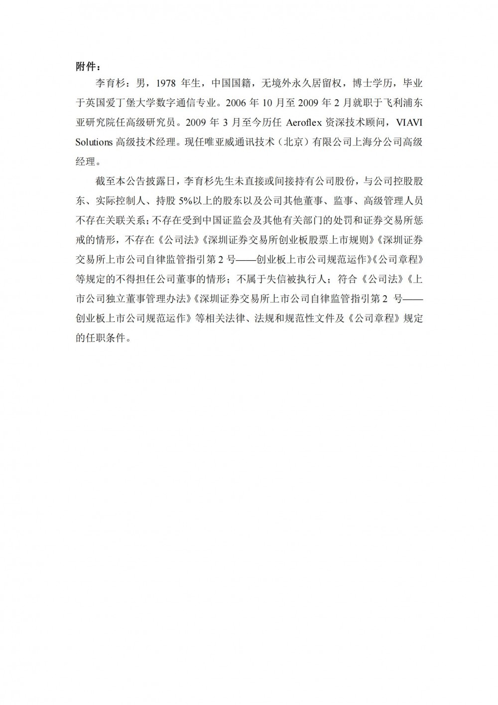 李育杉:男,1978年生,中国国籍,无境外永久居留权,博士学历,毕业于英国爱丁堡大学数字通信专业。2006年10月至2009年2月就职于飞利浦东亚研究院任高级研究员。2009年3月至今历任aeroflex资深技术顾问,viavisolutions高级技术经理。现任唯亚威通讯技术(北京)有限公司上海分公司高级经理。