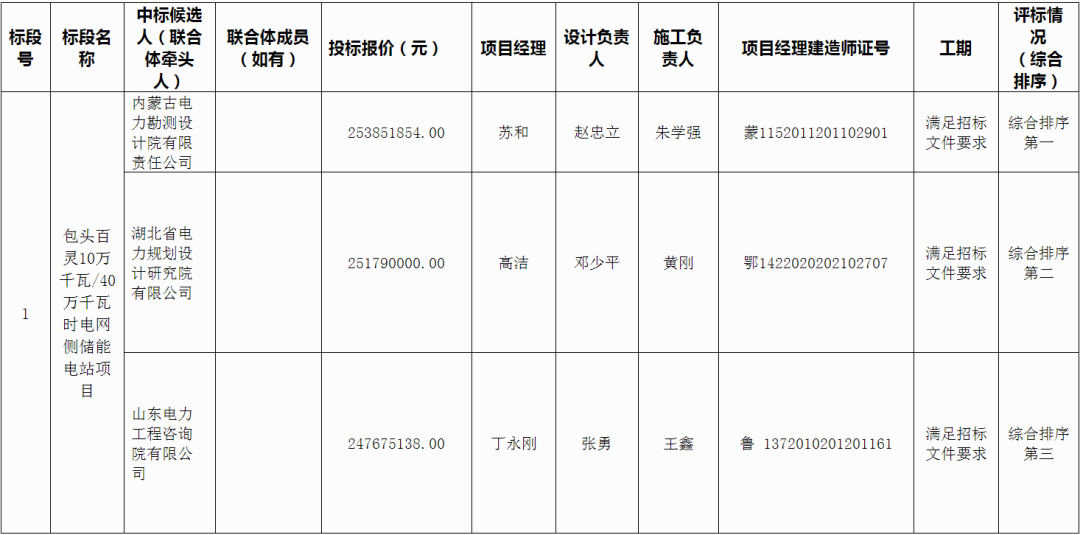 第一中标候选人为内蒙古电力勘测设计院有限责任公司,投标报价253851854元,折合单价0.6346元/wh;第二中标候选人为湖北省电力规划设计研究院有限公司,投标报价251790000元,折合单价0.6295元/wh;第三中标候选人为山东电力工程咨询院有限公司,投标报价247675138元,折合单价0.6192元/wh。