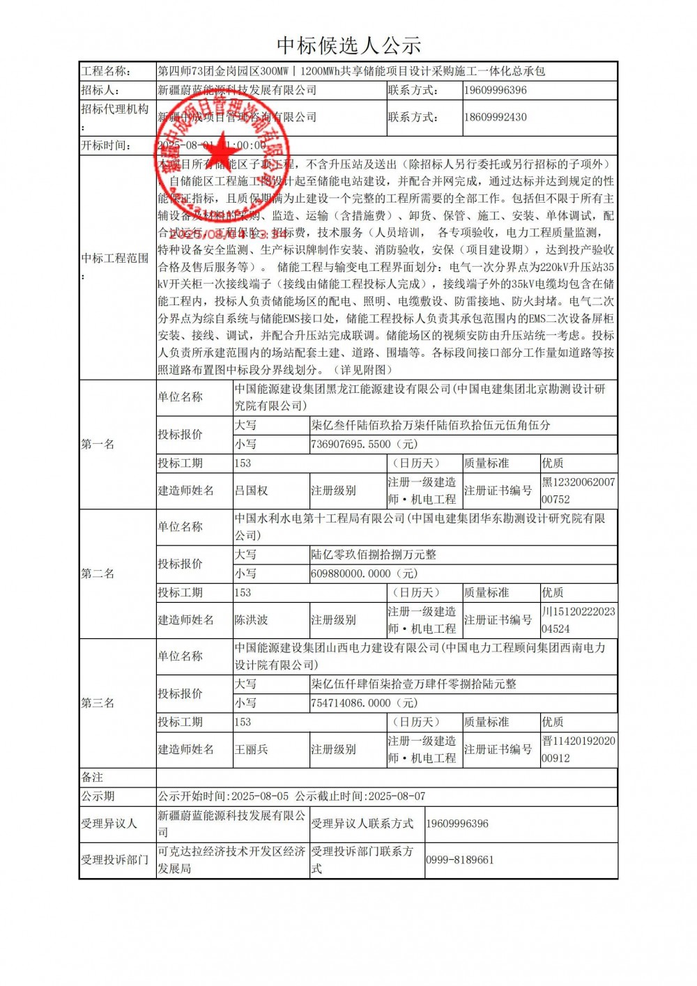 项目招标人为新疆生产建设兵团第四师电力有限责任公司旗下新疆蔚蓝能源科技发展有限公司。