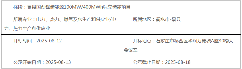 公示名称:景县国创锋储能源100mw/400mwh独立储能项目中标候选人公示