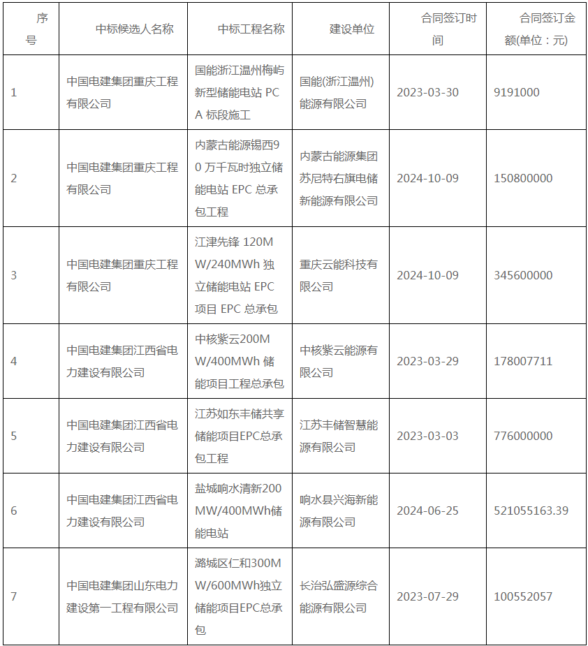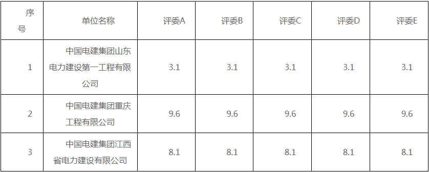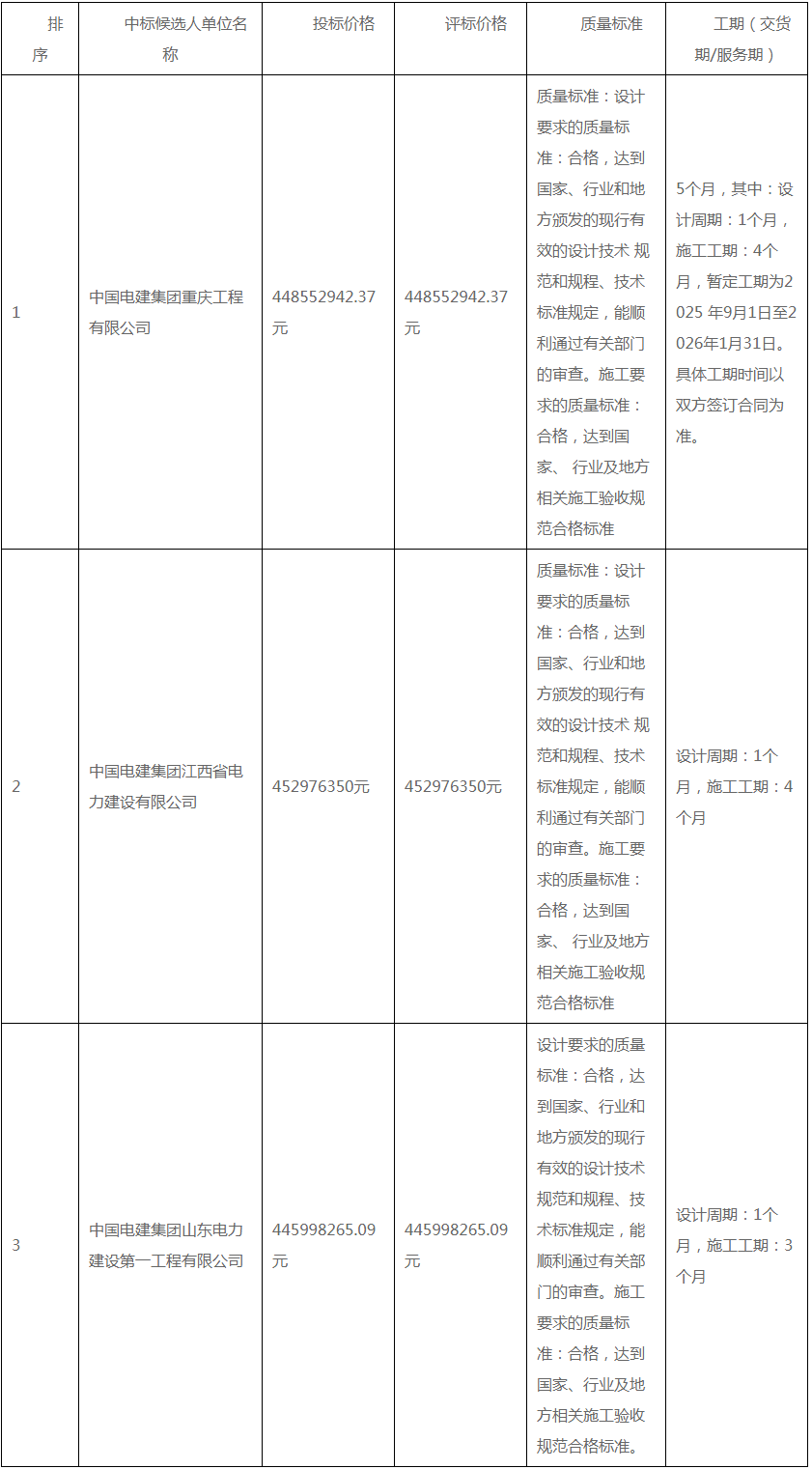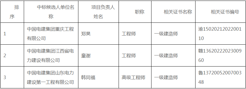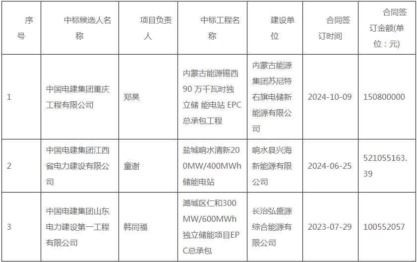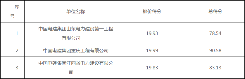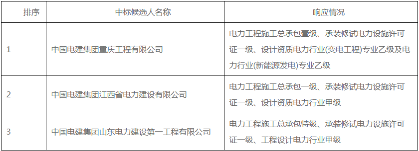 公告显示,项目第一中标候选人为中国电建集团重庆工程有限公司,投标报价为448552942.37元,折合单价1.1214元/wh;第二中标候选人为中国电建集团江西省电力建设有限公司,投标报价为452976350元,折合单价1.1324元/wh;第三中标候选人为中国电建集团山东电力建设第一工程有限公司,投标报价为445998265.09元,折合单价1.115元/wh。