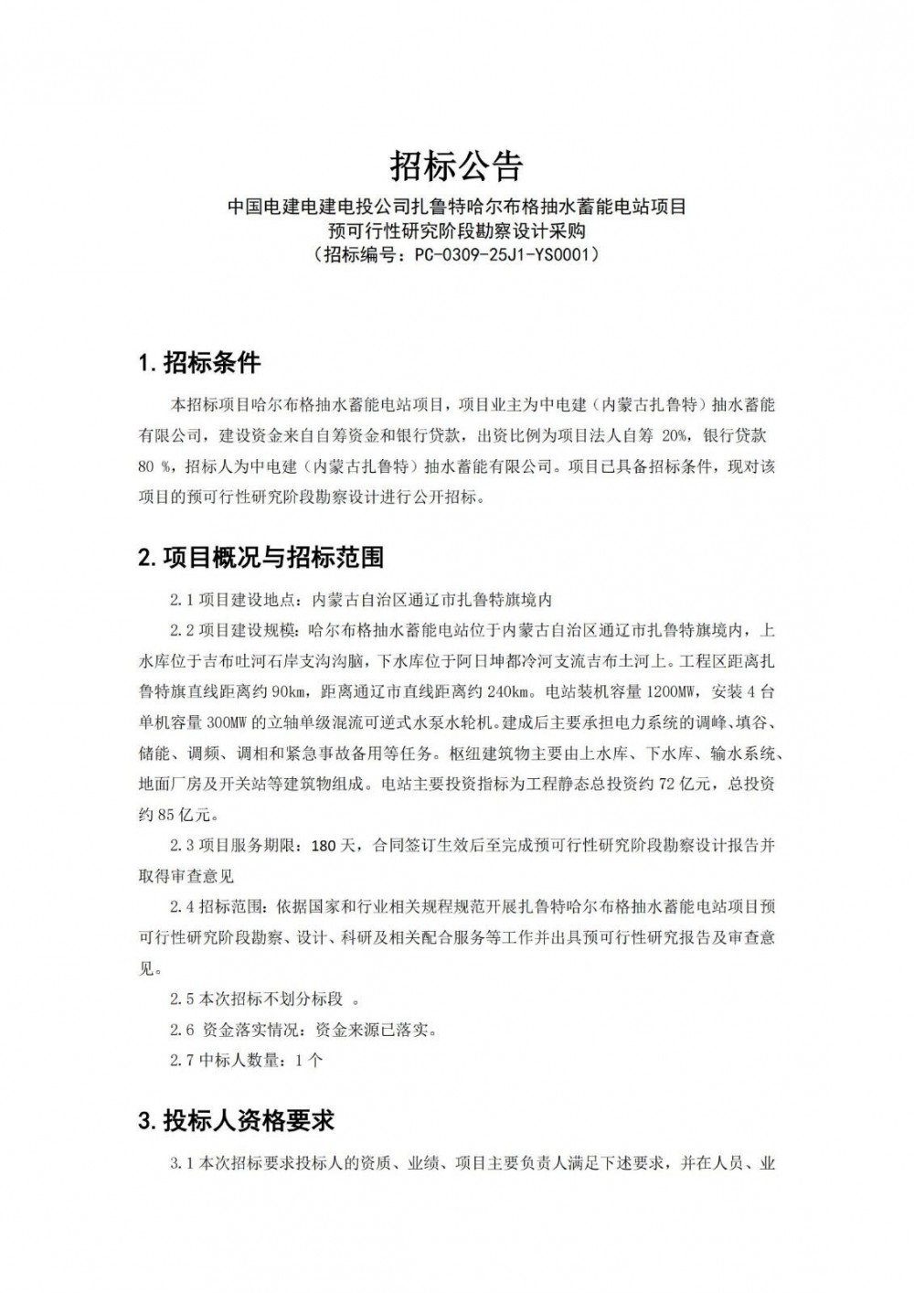 电建电投公司扎鲁特哈尔布格抽水蓄能电站项目预可行性研究阶段勘察设计采购招标公告发布。