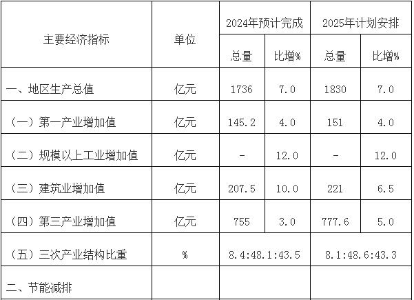按照以上总体要求,2025年经济社会发展的主要预期目标是:地区生产总值增长7%,其中第一产业增加值增长4%,规模以上工业增加值增长12%,建筑业增加值增长6.5%,第三产业增加值增长5%;固定资产投资增长6%;社会消费品零售总额增长6.5%;出口总额增长0.1%,实际利用外资增长1%;一般公共预算总收入增长3%,地方一般公共预算收入增长3%;居民消费价格总水平运行在合理区间内,城镇居民人均可支配收入增长7%,农村居民人均可支配收入增长7%;完成节能减排降碳任务。
