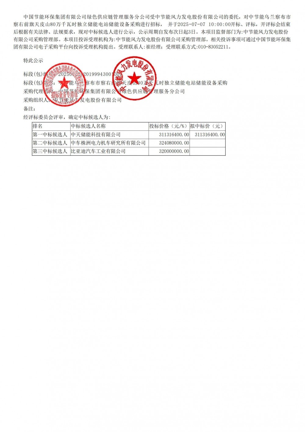 第一中标候选人为中天储能科技有限公司,投标报价为311316400元,折合单价0.3891元/wh;第二中标候选人为中车株洲电力机车研究所有限公司,投标报价为324080000元,折合单价0.4051元/wh;第三中标候选人为比亚迪汽车工业有限公司,投标报价为320000000元,折合单价0.4元/wh。