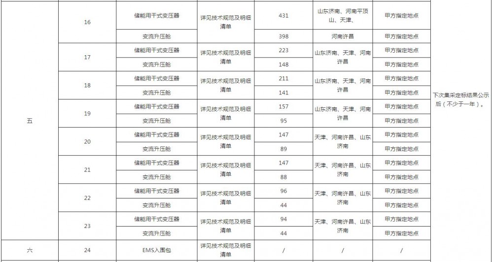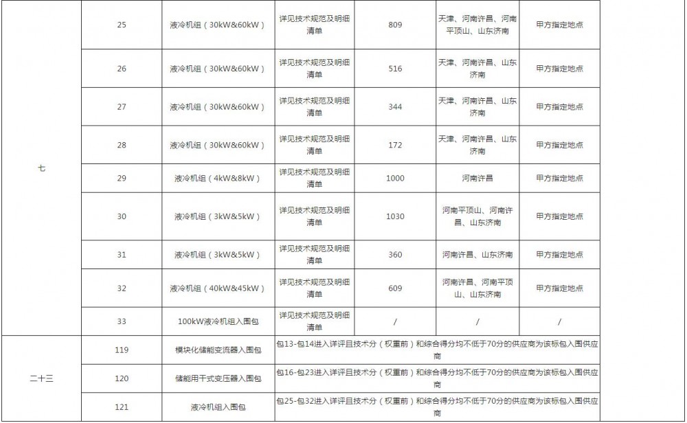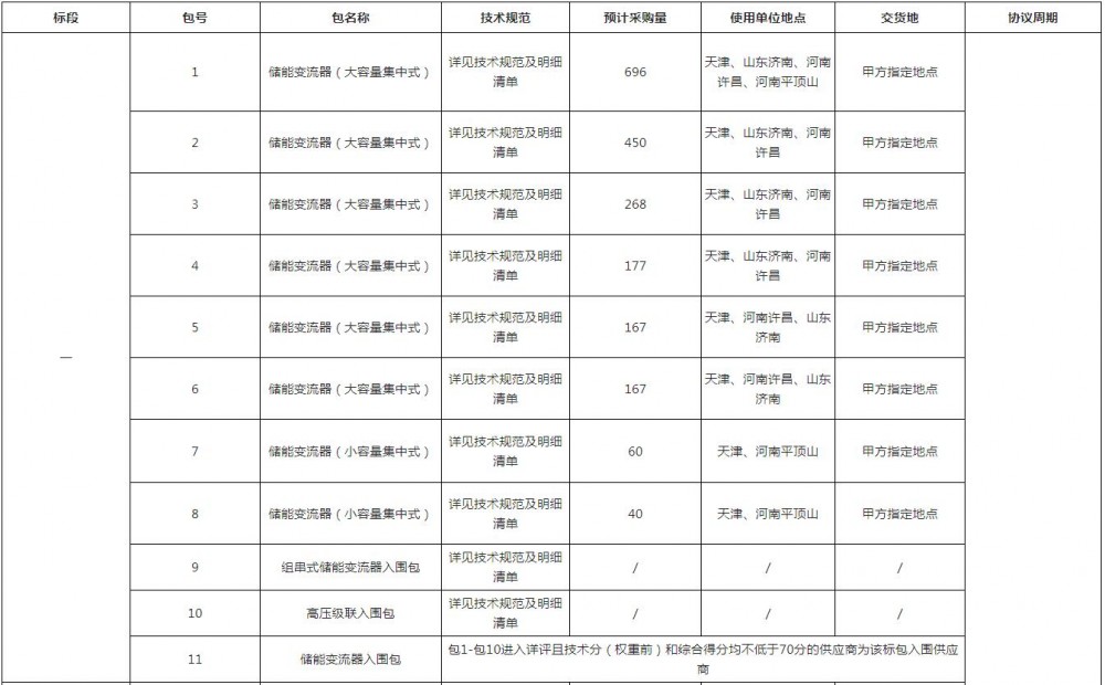 采购范围共分为8个标段、36个标包。其中,预计采购储能变流器2925套、储能用干式变压器1506套、变流升压舱1047套、液冷机组4840套。使用地点覆盖天津、河南、山东。此外,还有高压级联储能变流器、户储逆变器、ems采购未公布规模。