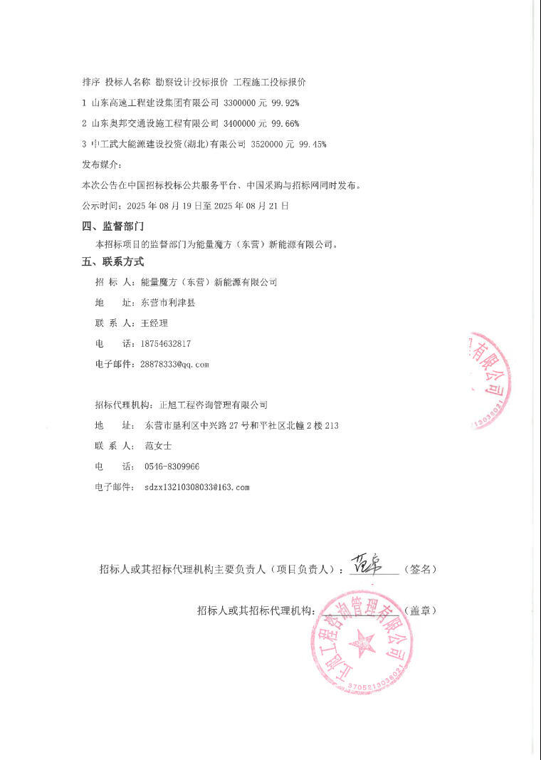 第一中标候选人为山东高速工程建设集团有限公司,勘察设计投标报价为3300000元,工程施工标报价费率99.92%;第二中标候选人为山东奥邦交通设施工程有限公司,勘察设计投标报价为3400000元,工程施工标报价费率99.66%;第三中标候选人为中工武大能源建设投资(湖北)有限公司,勘察设计投标报价为3520000元,工程施工标报价费率99.45%。