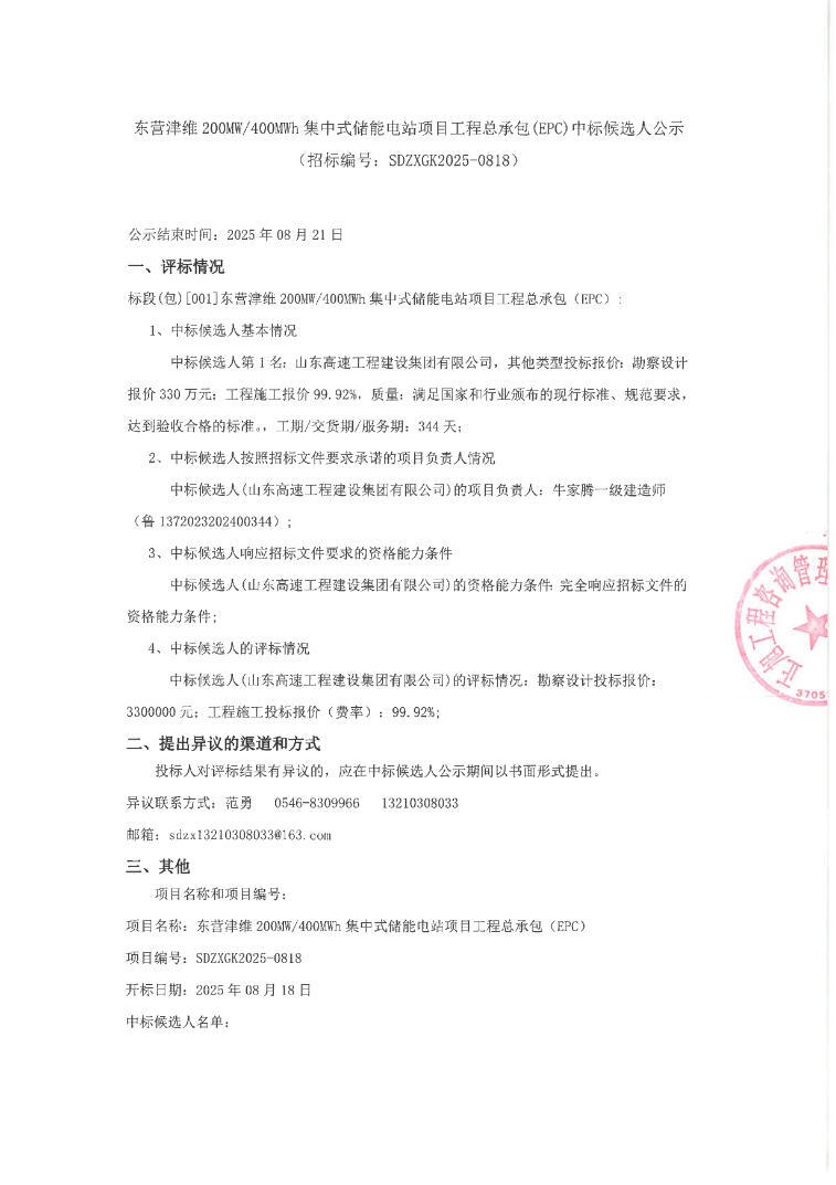 项目工程总承包(epc)中标候选人公示。