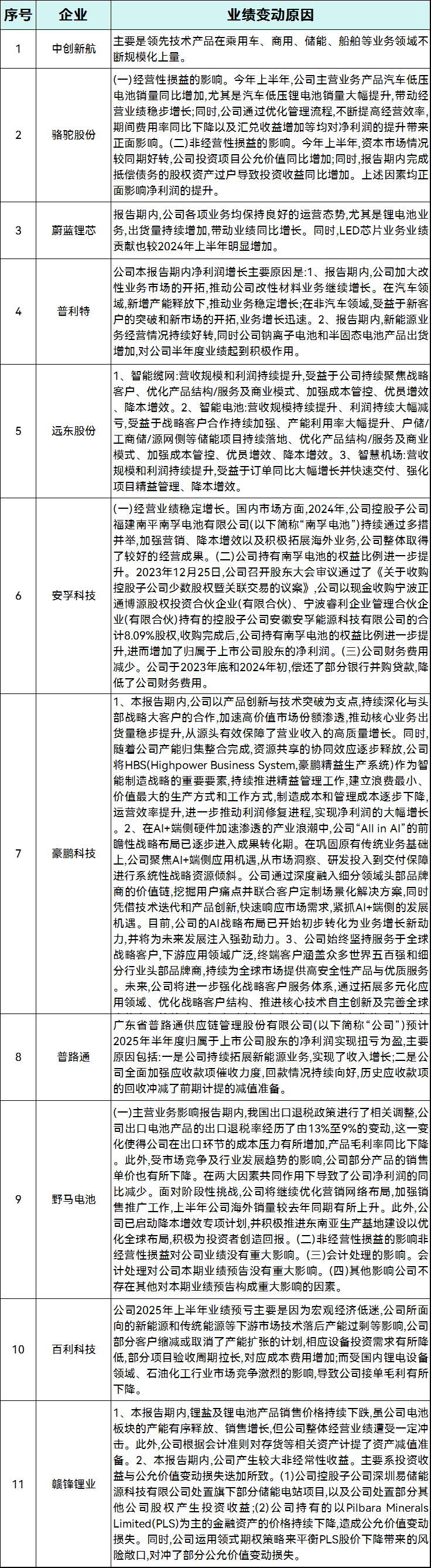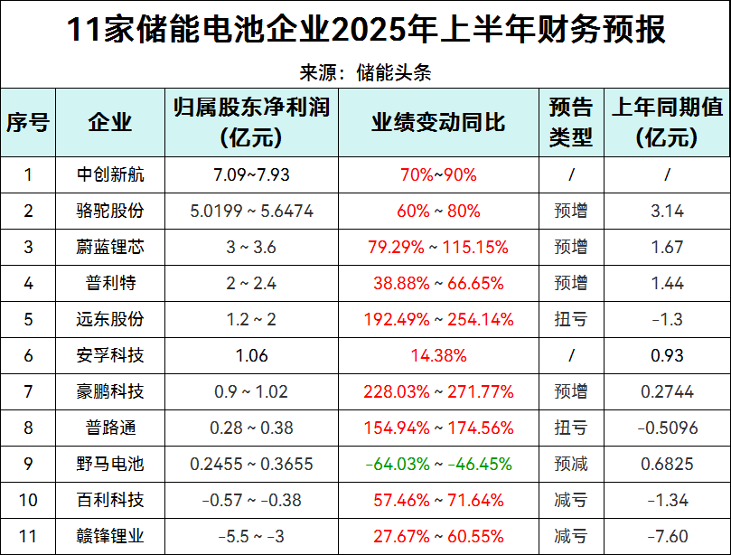 据能源圈统计,目前已有11家储能电池企业发布了2025年上半年业绩预告,9家企业实现盈利,百利科技、赣锋锂业预计将出现亏损。