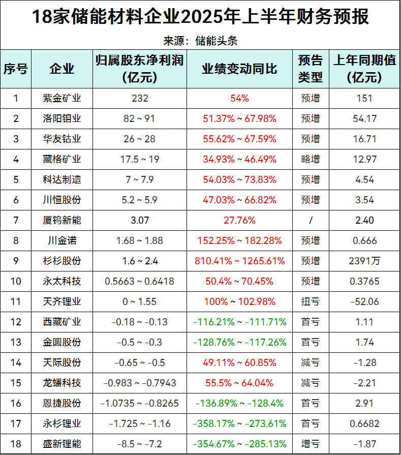 据能源圈统计,目前已有18家储能材料企业发布了2025年上半年业绩预告,11家企业实现盈利,西藏矿业、金圆股份、天际股份、龙蟠科技、恩捷股份、永杉锂业、盛新锂能8家企业预计将出现亏损。
