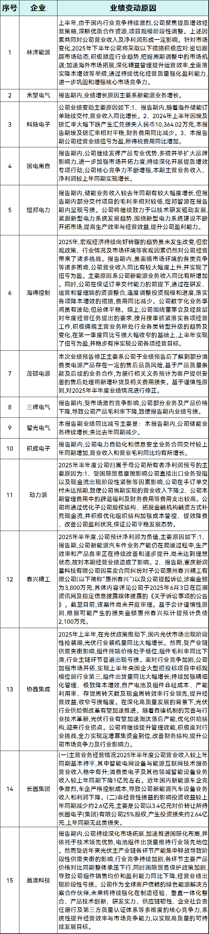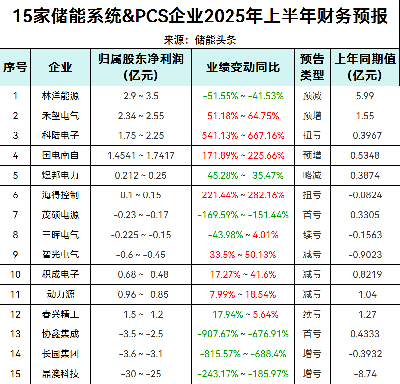 据能源圈统计,目前已有15家储能系统&psc企业发布了2025年上半年业绩预告,6家企业实现盈利,9家企业预计将出现亏损;从业绩涨幅来看,6家企业净利润较去年同期上涨。