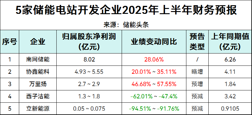 据能源圈统计,目前已有5家储能电站开发企业发布了2025年上半年业绩预告,3家企业实现盈利,2家企业预计将出现亏损。