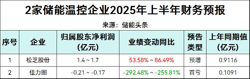 2025年上半年仅有两家储能温控企业发布业绩预报。