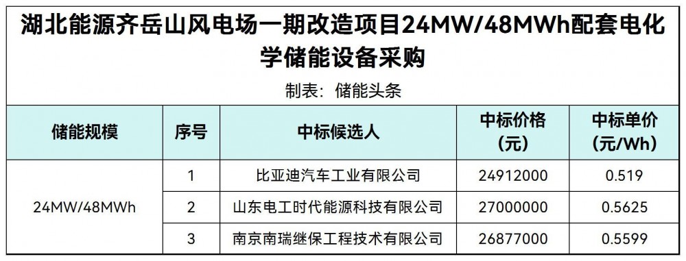 8月20日,湖北能源齐岳山风电场一期改造项目24mw/48mwh配套电化学储能设备采购中标候选人公示。