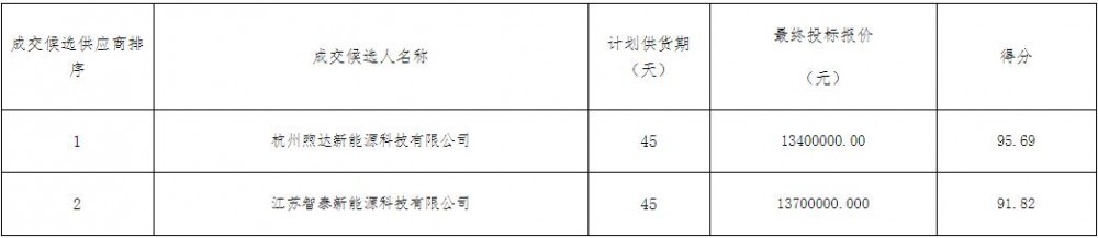 第一中标候选人为杭州煦达新能源科技有限公司,投标报价为13400000元,折合单价1.34元/wh;第二中标候选人为江苏智泰新能源科技有限公司,投标报价为13700000元,折合单价1.37元/wh。