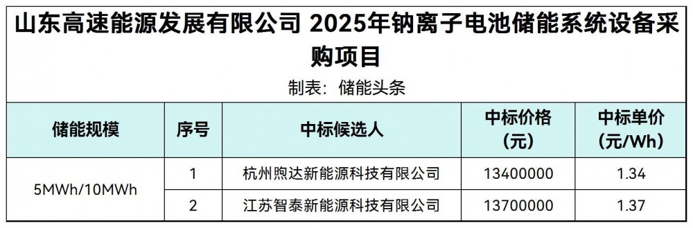 8月20日,山东高速能源发展有限公司 2025年钠离子电池储能系统设备采购项目中标候选人公示。