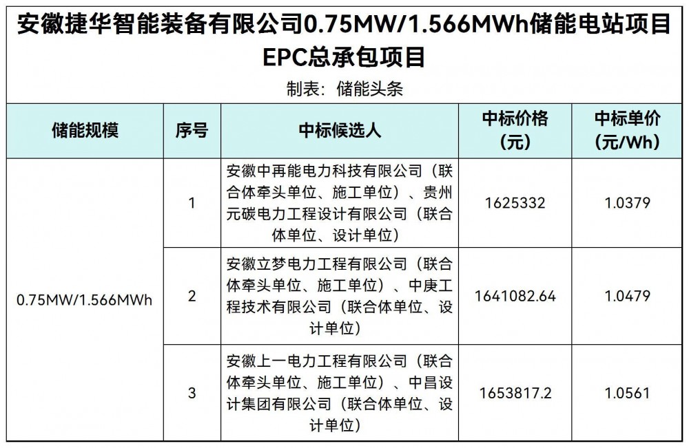 第一中标候选人为安徽中再能电力科技有限公司&贵州元碳电力工程设计有限公司联合体,投标报价为1625332元,折合单价1.0379元/wh;第二中标候选人为安徽立梦电力工程有限公司&中庚工程技术有限公司联合体,投标报价为1641082.64元,折合单价1.0479元/wh;第三中标候选人为安徽上一电力工程有限公司&中昌设计集团有限公司联合体,投标报价为1653817.2元,折合单价1.0561元/wh。