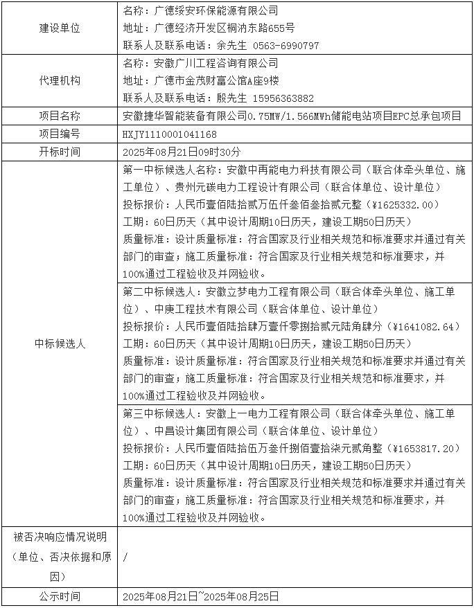 安徽捷华智能装备有限公司0.75mw/1.566mwh储能电站项目epc总承包项目中标候选人公示