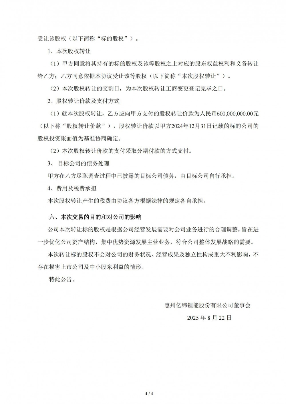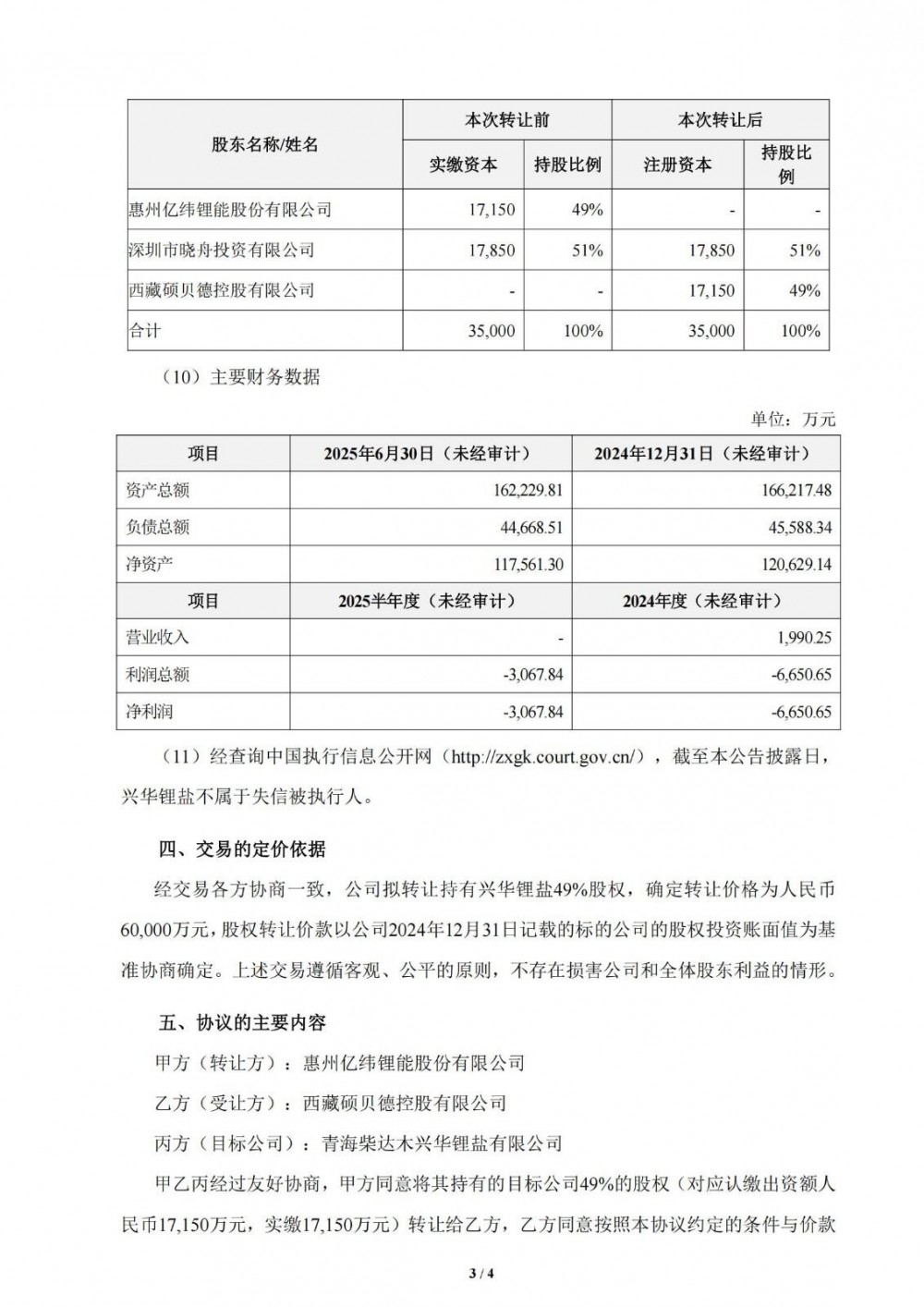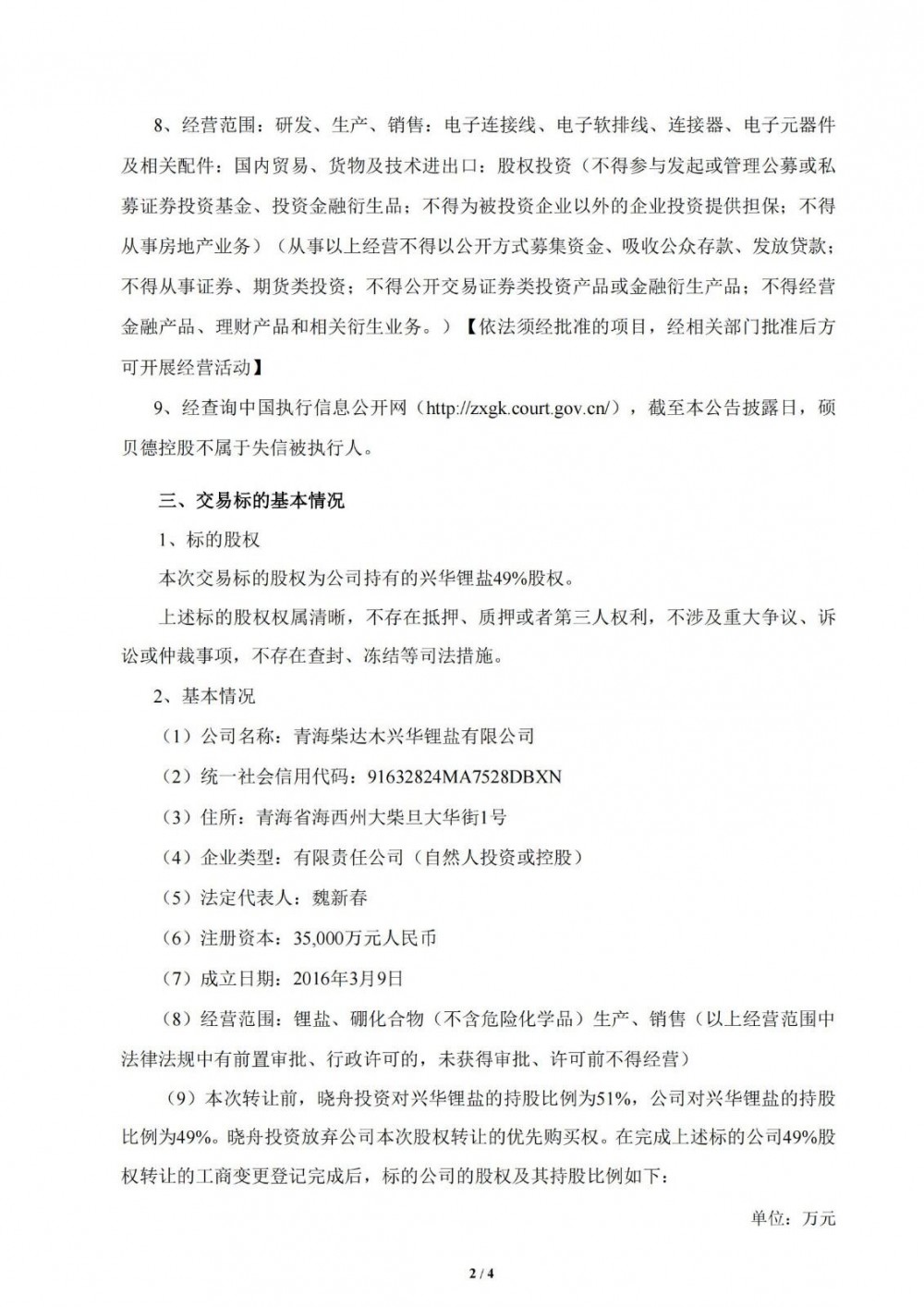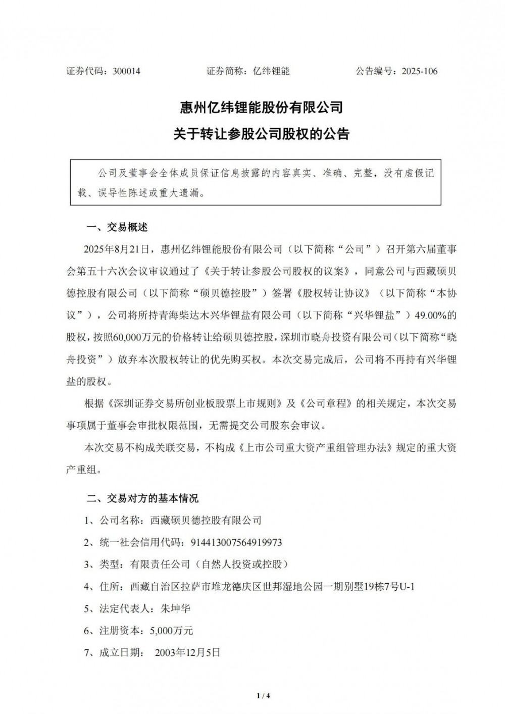 8月22日,亿纬锂能发布公告称,公司召开第六届董事会第五十六次会议审议通过了《关于转让参股公司股权的议案》,同意公司与西藏硕贝德控股有限公司(以下简称“硕贝德控股”)签署《股权转让协议》,公司将所持青海柴达木兴华锂盐有限公司49.00%的股权,按照60,000万元的价格转让给硕贝德控股,深圳市晓舟投资有限公司放弃本次股权转让的优先购买权。本次交易完成后,公司将不再持有兴华锂盐的股权。