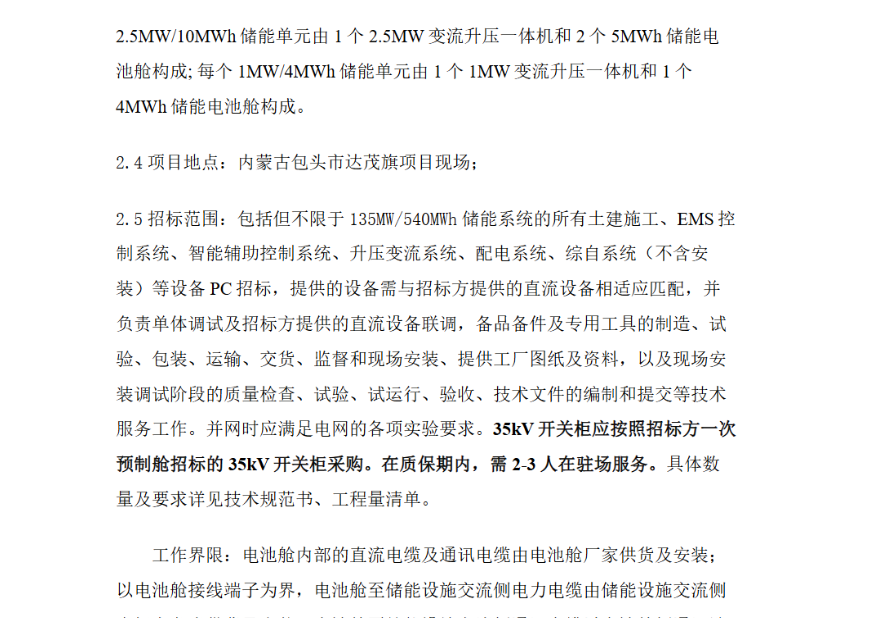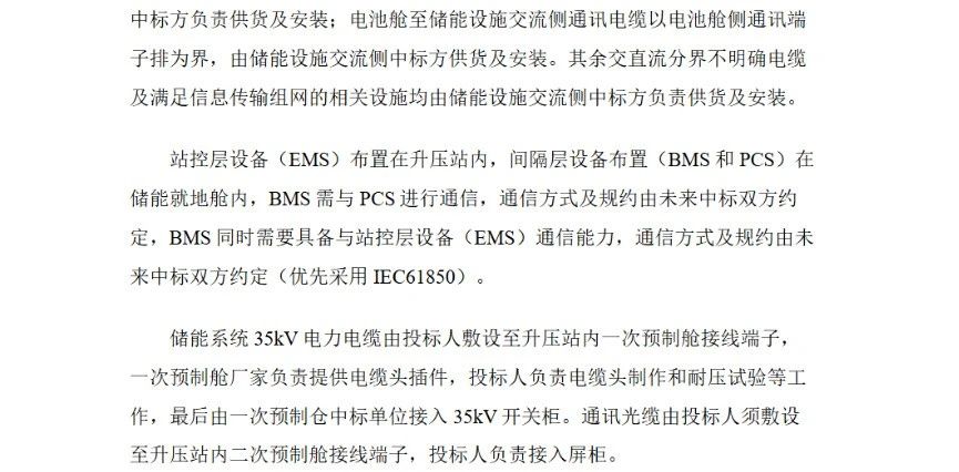 招标范围:项目包括但不限于135mw/540mwh储能系统的所有土建施工、ems控制系统、智能辅助控制系统、升压变流系统、配电系统、综自系统(不含安装)等设备pc招标,提供的设备需与招标方提供的直流设备相适应匹配,并负责单体调试及招标方提供的直流设备联调,备品备件及专用工具的制造、试验、包装、运输、交货、监督和现场安装、提供工厂图纸及资料,以及现场安装调试阶段的质量检查、试验、试运行、验收、技术文件的编制和提交等技术服务工作。并网时应满足电网的各项实验要求。