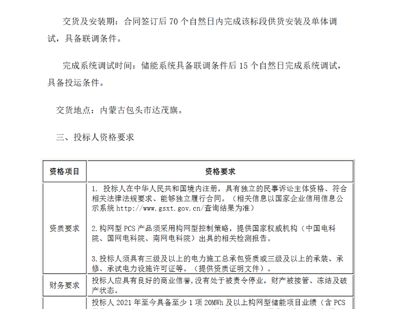 完成系统调试时间:储能系统具备联调条件后 15 个自然日完成系统调试具各投运条件。