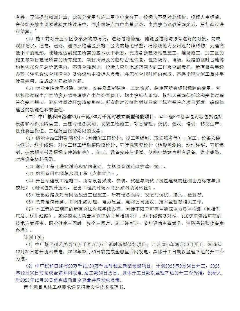 中广核和田洛浦200mw/800mwh独立新型储能项目位于新疆和田地区洛浦县境内,距洛浦县约20公里,拟建设集中式电化学储能电站。计划2025年9月30日开工,2025年12月30日前完成全部并网发电,总工期90日历日。投标人对2025年12月30日前完成项目全容量并网发电负责。