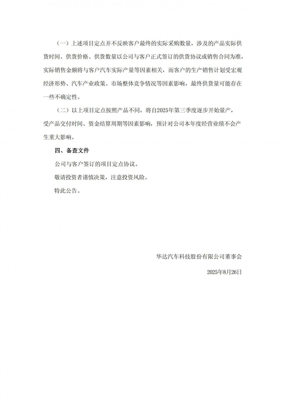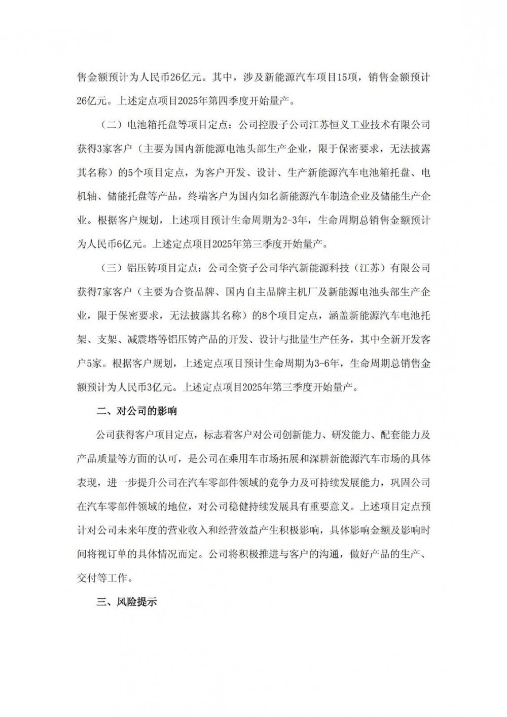 (三)铝压铸项目定点:公司全资子公司华汽新能源科技(江苏)有限公司获得7家客户(主要为合资品牌、国内自主品牌主机厂及新能源电池头部生产企业,限于保密要求,无法披露其名称)的8个项目定点,涵盖新能源汽车电池托架、支架、减震塔等铝压铸产品的开发、设计与批量生产任务,其中全新开发客户5家。根据客户规划,上述定点项目预计生命周期为3-6年,生命周期总销售金额预计为人民币3亿元。上述定点项目2025年第三季度开始量产。