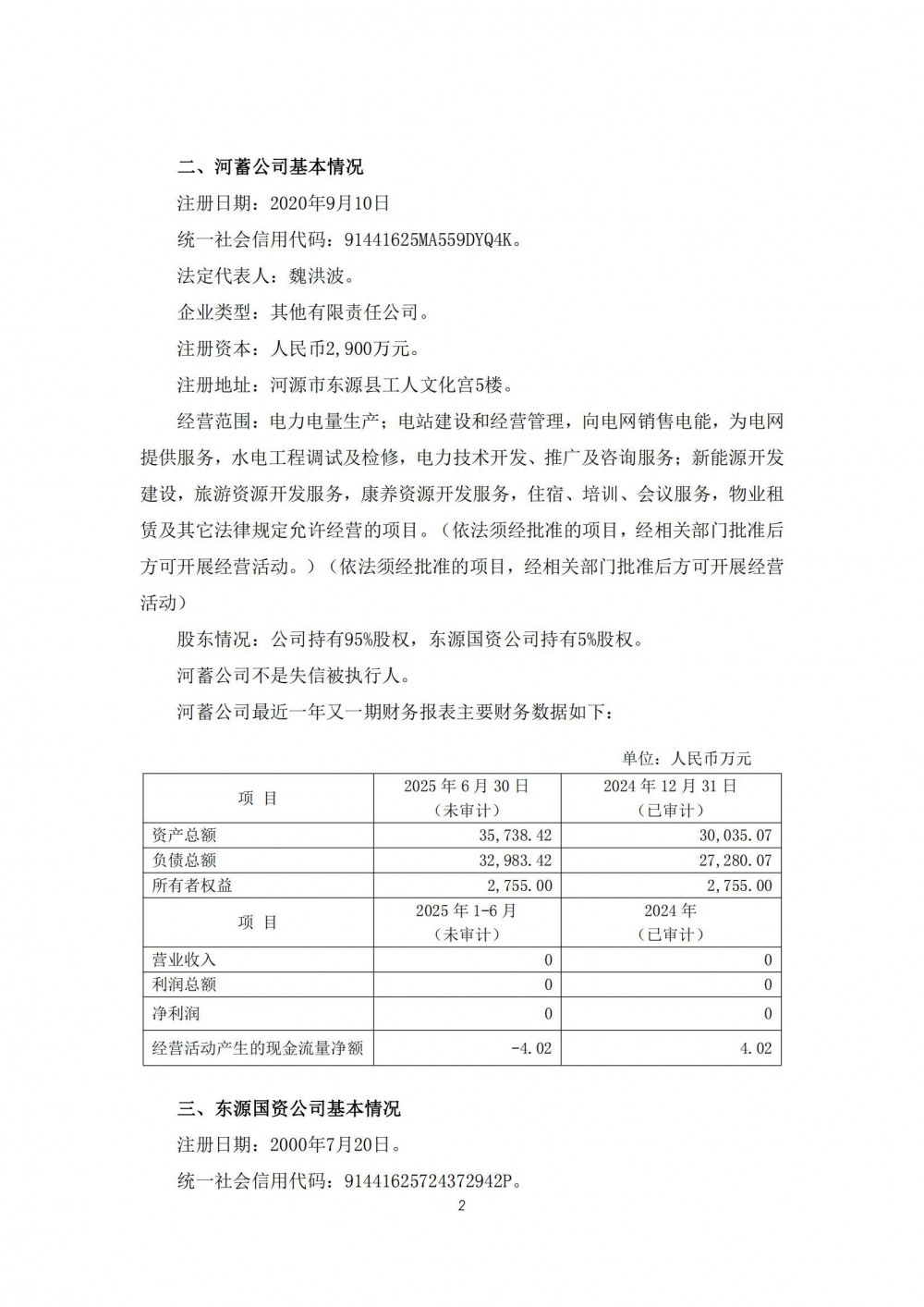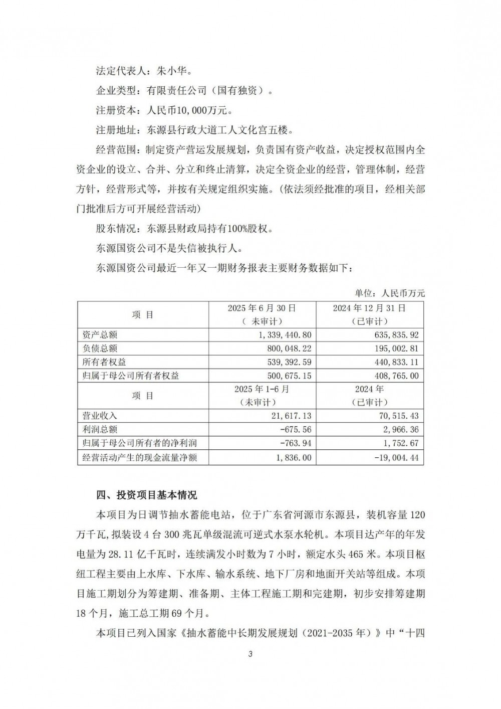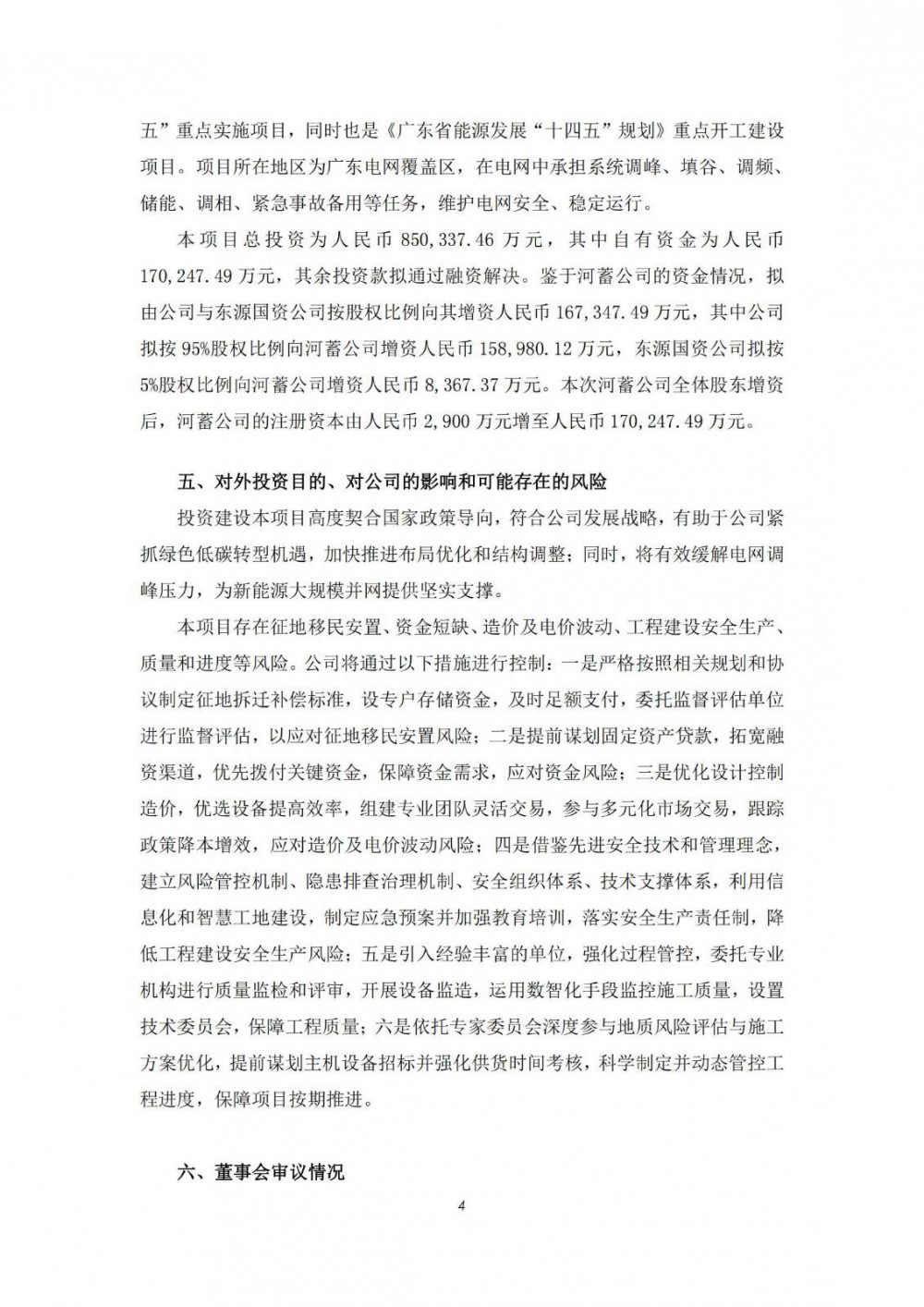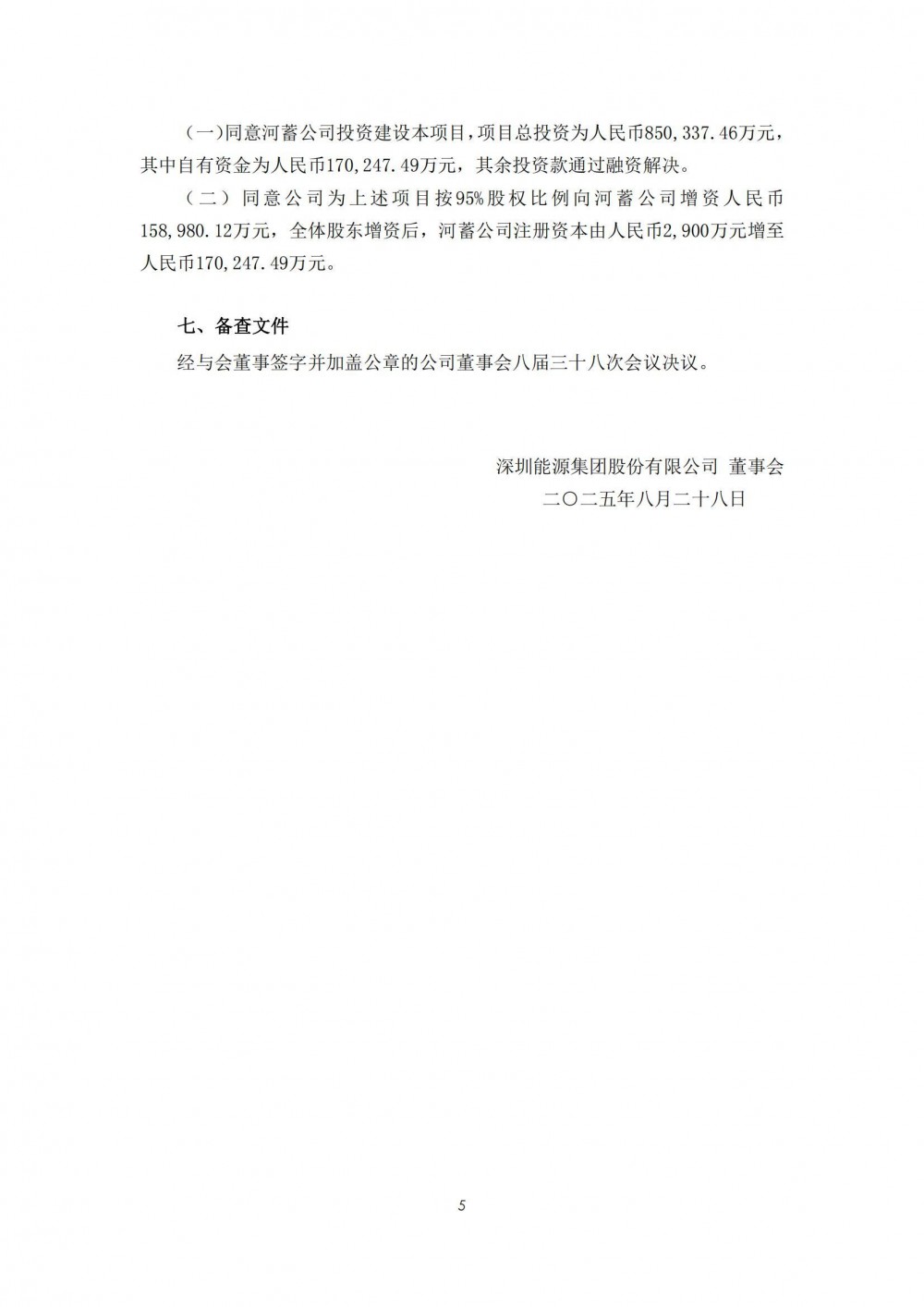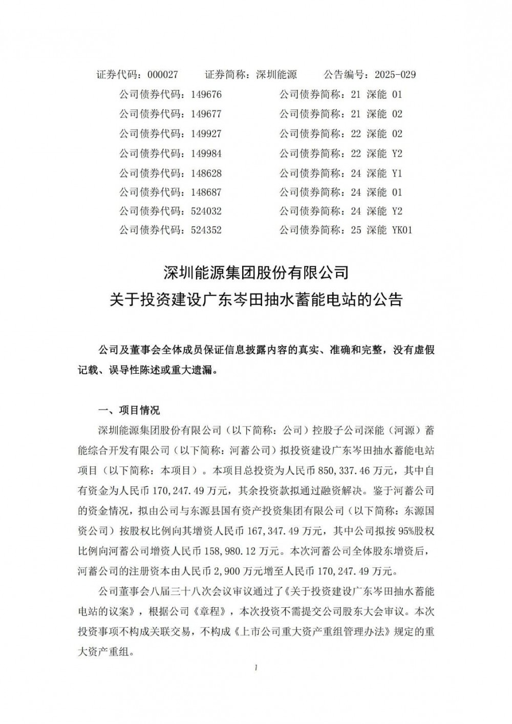 8月27日,深圳能源发布公告称,公司控股子公司深能(河源)蓄能综合开发有限公司拟投资建设广东岑田抽水蓄能电站项目。本项目总投资为人民币850,337.46万元,其中自有资金为人民币170,247.49万元,其余投资款拟通过融资解决。鉴于河蓄公司的资金情况,拟由公司与东源县国有资产投资集团有限公司按股权比例向其增资人民币167,347.49万元,其中公司拟按95%股权比例向河蓄公司增资人民币158,980.12万元。本次河蓄公司全体股东增资后,河蓄公司的注册资本由人民币2,900万元增至人民币170,247.49万元。