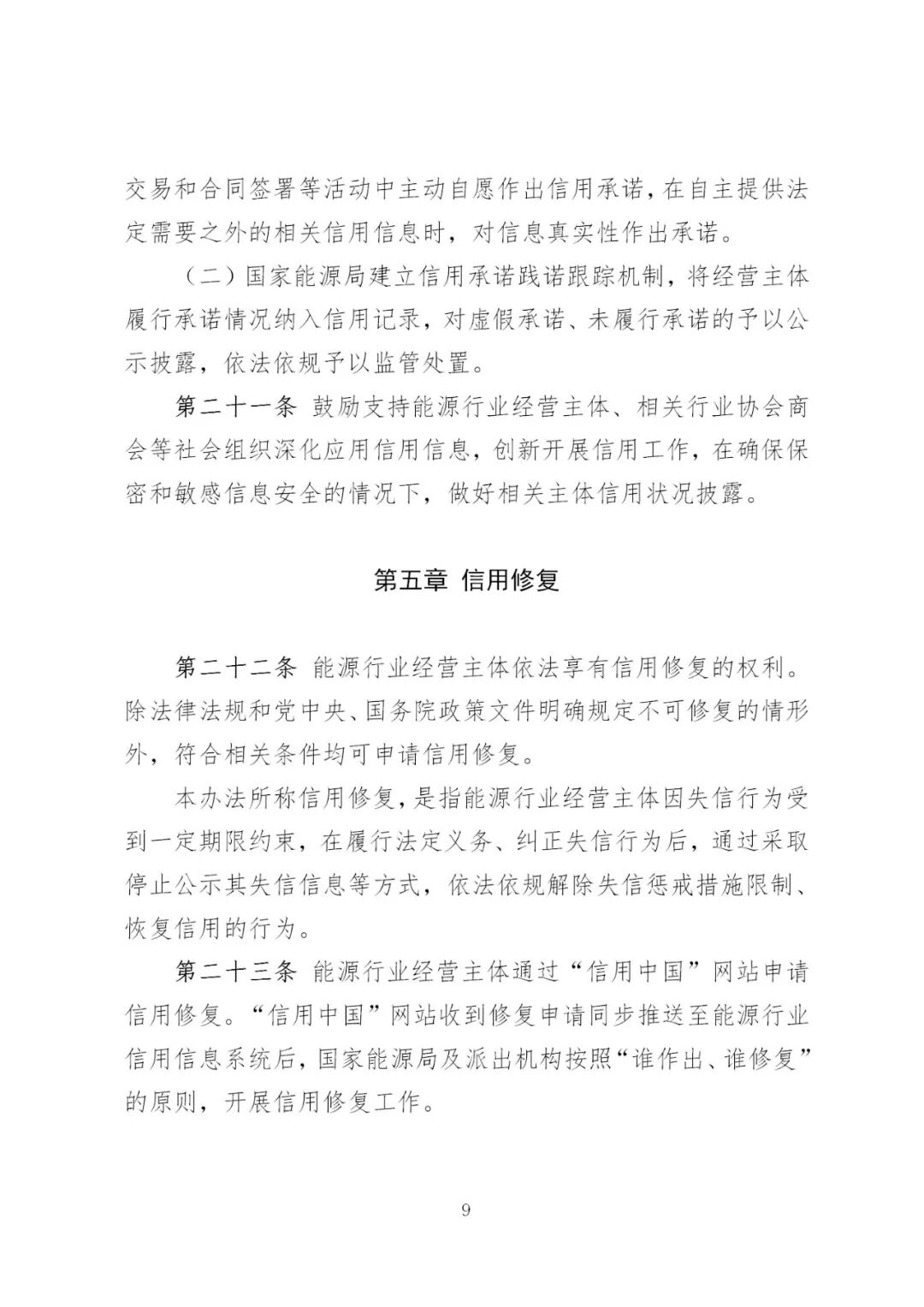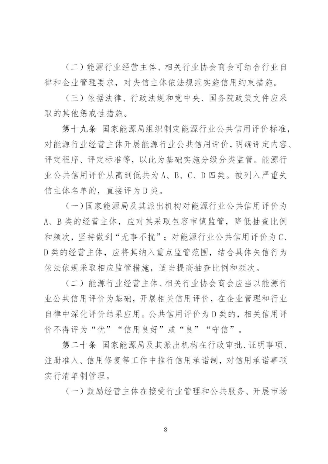 国家能源局组织制定并动态更新能源行业信用信息应用清单,推动信用信息共享和应用,指导开展信用评价,实施信用分级分类监管,强化对守信行为的激励,依法依规对失信行为实施惩戒。