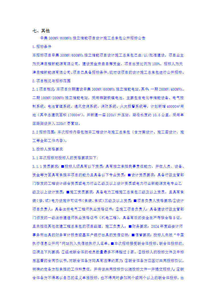 9月5日,辛集300mw/600mwh独立储能项目设计施工总承包公开招标公告发布。