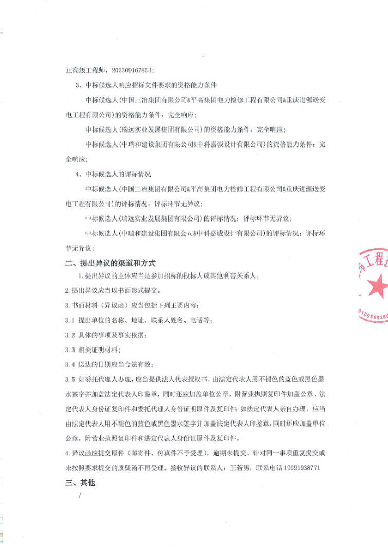 第一中标候选人为中国三冶集团有限公司&平高集团电力检修工程有限公司&重庆进源送变电工程有限公司,投标报价为15680万元,折合单价1.12元/wh;第二中标候选人为瑞远实业发展集团有限公司,投标报价为16300万元,折合单价1.087元/wh;第三中标候选人为中瑞和建设集团有限公司&中科嘉诚设计有限公司,投标报价为15000万元,折合单价1.1565元/wh。