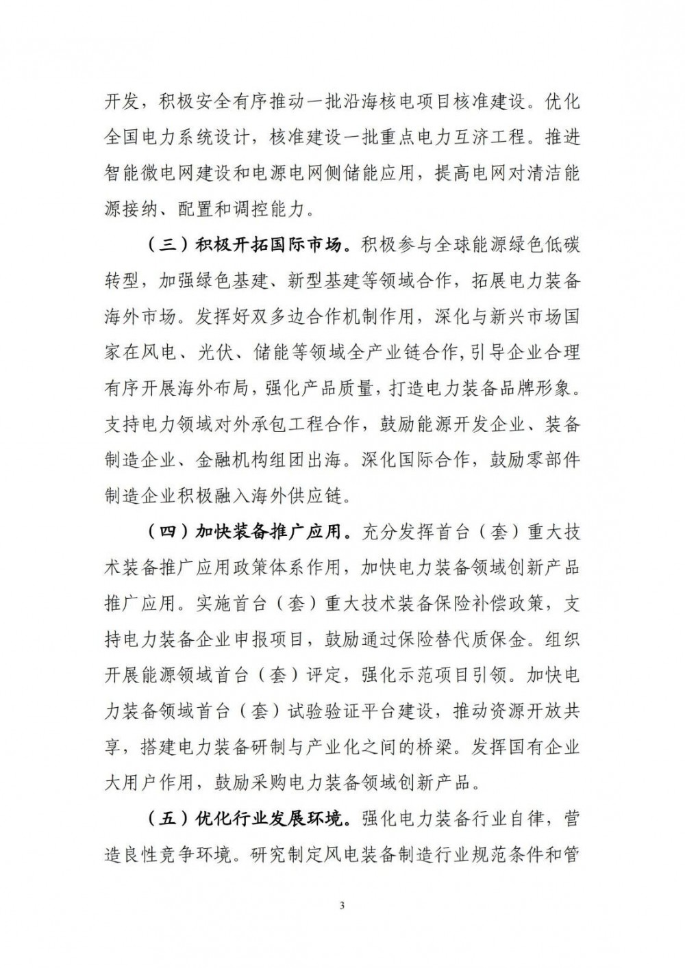 积极参与全球能源绿色低碳转型,加强绿色基建、新型基建等领域合作,拓展电力装备海外市场。发挥好双多边合作机制作用,深化与新兴市场国家在风电、光伏、储能等领域全产业链合作,引导企业合理有序开展海外布局,强化产品质量,打造电力装备品牌形象。支持电力领域对外承包工程合作,鼓励能源开发企业、装备制造企业、金融机构组团出海。深化国际合作,鼓励零部件制造企业积极融入海外供应链。