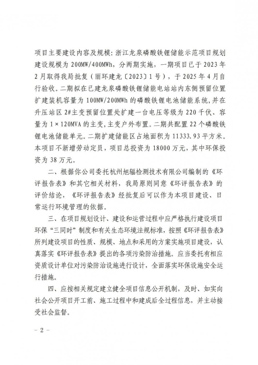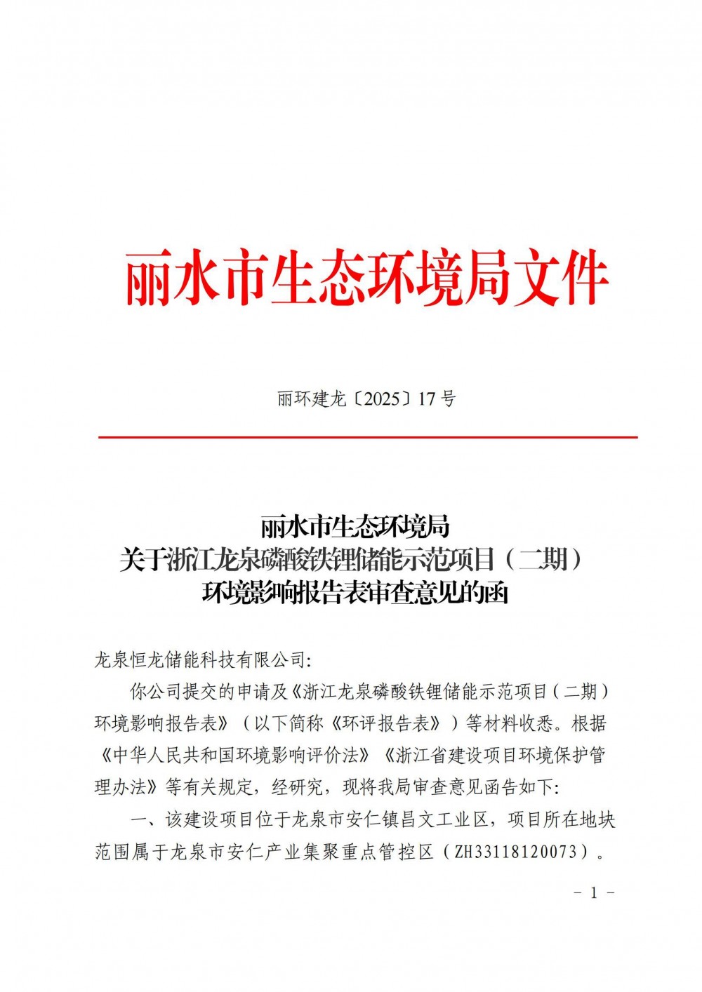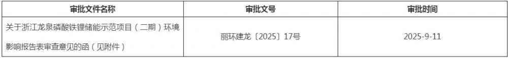 丽水市生态环境局龙泉分局关于2025年9月11日作出的浙江龙泉磷酸铁锂储能示范项目(二期)环境影响评价文件审批决定的公告