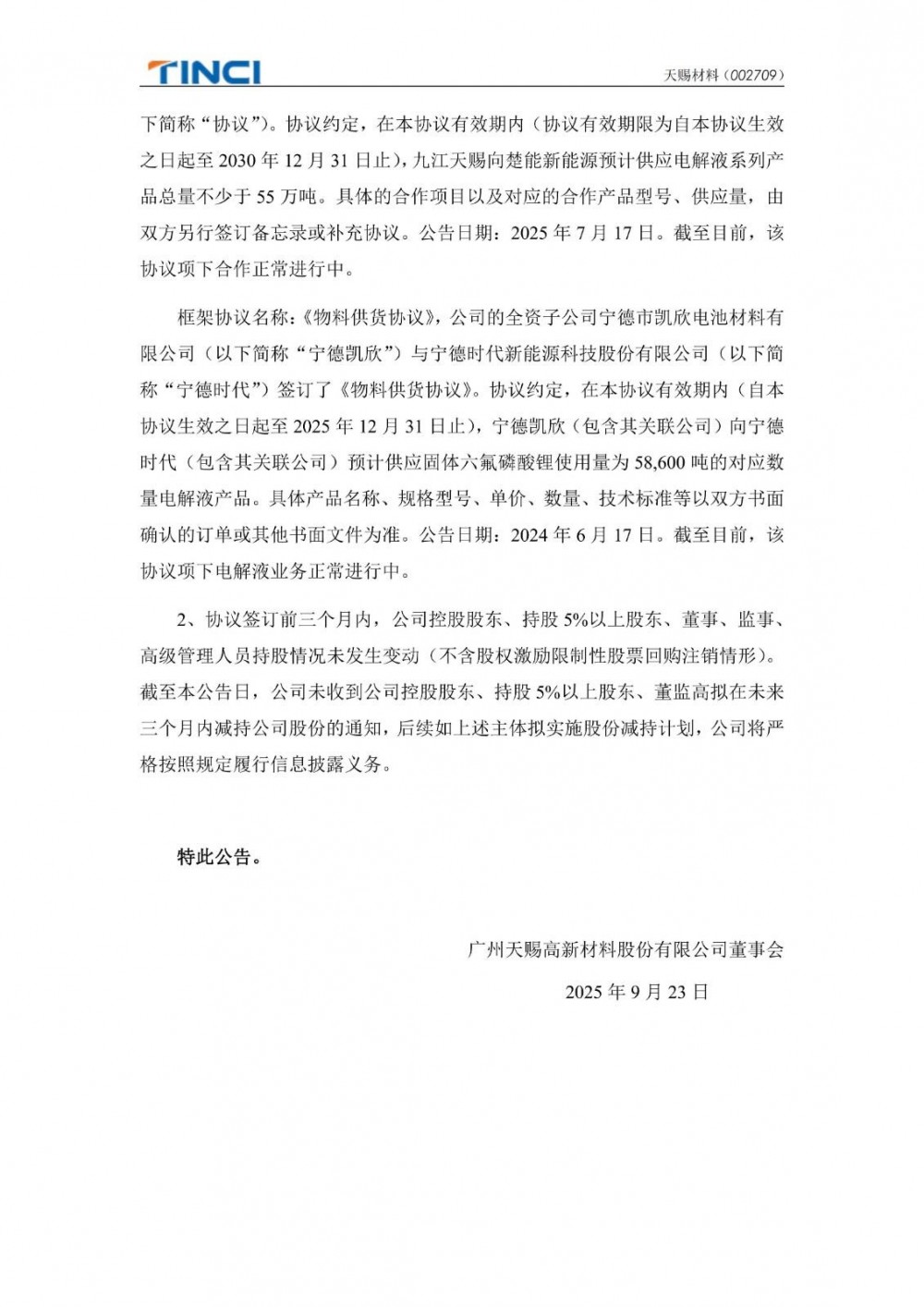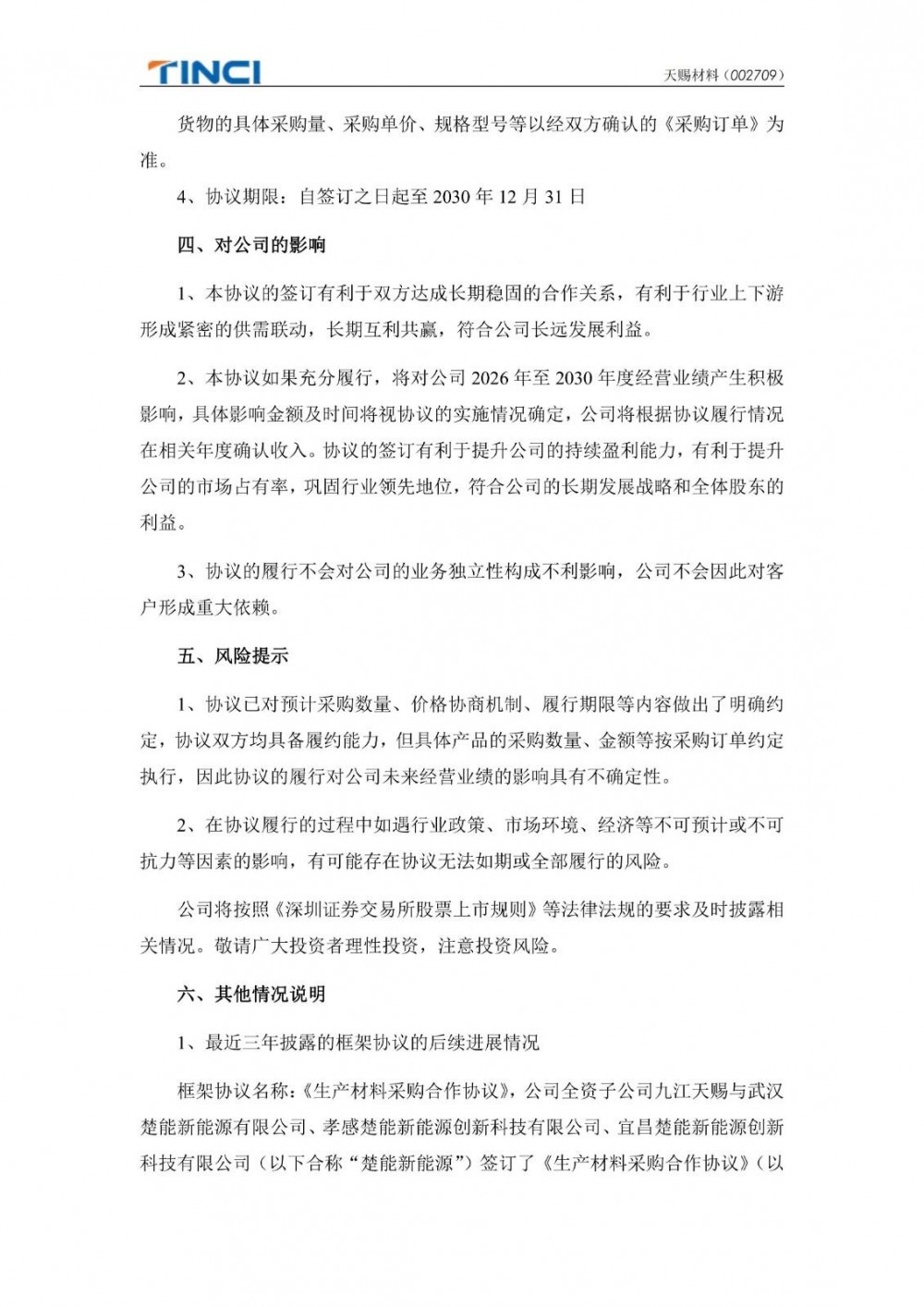 天赐材料表示,本协议如果充分履行,将对公司2026年至2030年度经营业绩产生积极影响,具体影响金额及时间将视协议的实施情况确定,公司将根据协议履行情况在相关年度确认收入。协议的签订有利于提升公司的持续盈利能力,有利于提升公司的市场占有率,巩固行业领先地位,符合公司的长期发展战略和全体股东的利益。