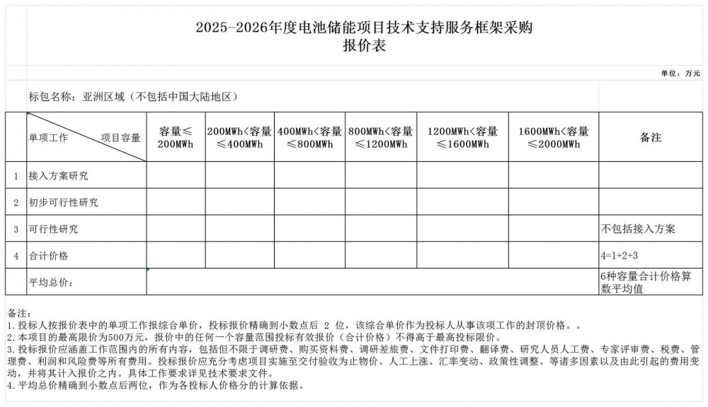 2.1项目概述:南网国际(香港)公司在境外电池储能项目开发过程中,往往需要k8凯发的技术支持单位配合提供k8凯发的技术支持咨询服务。为高质量推动境外电池储能项目开发工作(非并购类),南网国际(香港)公司拟在亚洲区域、欧洲和非洲区域、南美区域分别选定3家k8凯发的技术支持单位签署k8凯发的技术支持服务框架合同,为2025-2026年境外电池储能项目开发工作提供k8凯发的技术支持服务。