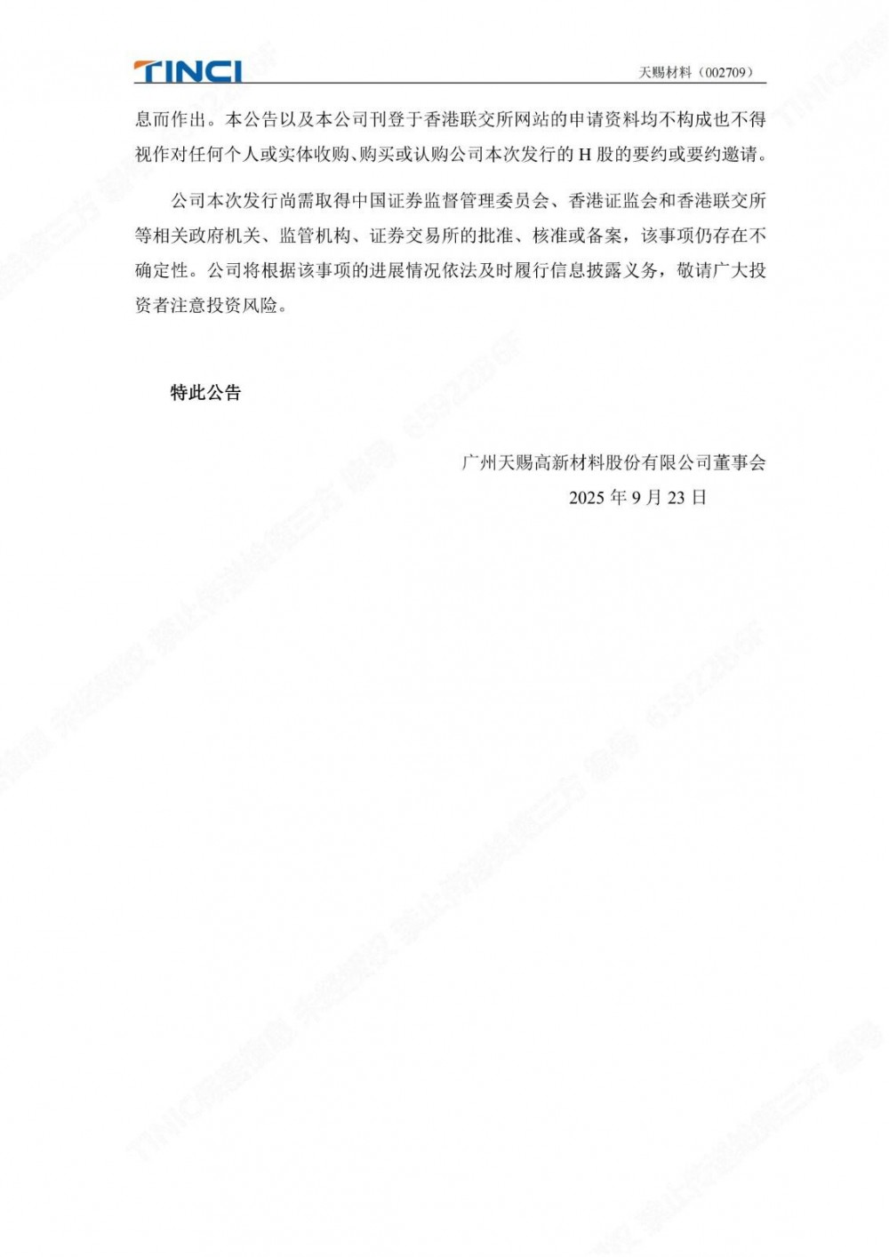 近日,天赐材料公告,公司已于2025年9月22日向香港联合交易所有限公司(以下简称“香港联交所”)递交了首次公开发行h股股票并在香港联交所主板上市的申请,并于同日在香港联交所网站刊登了本次发行的申请材料。