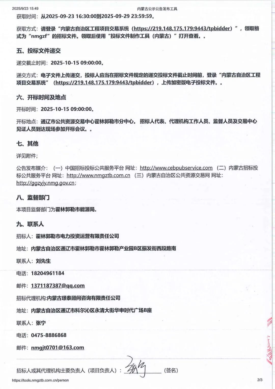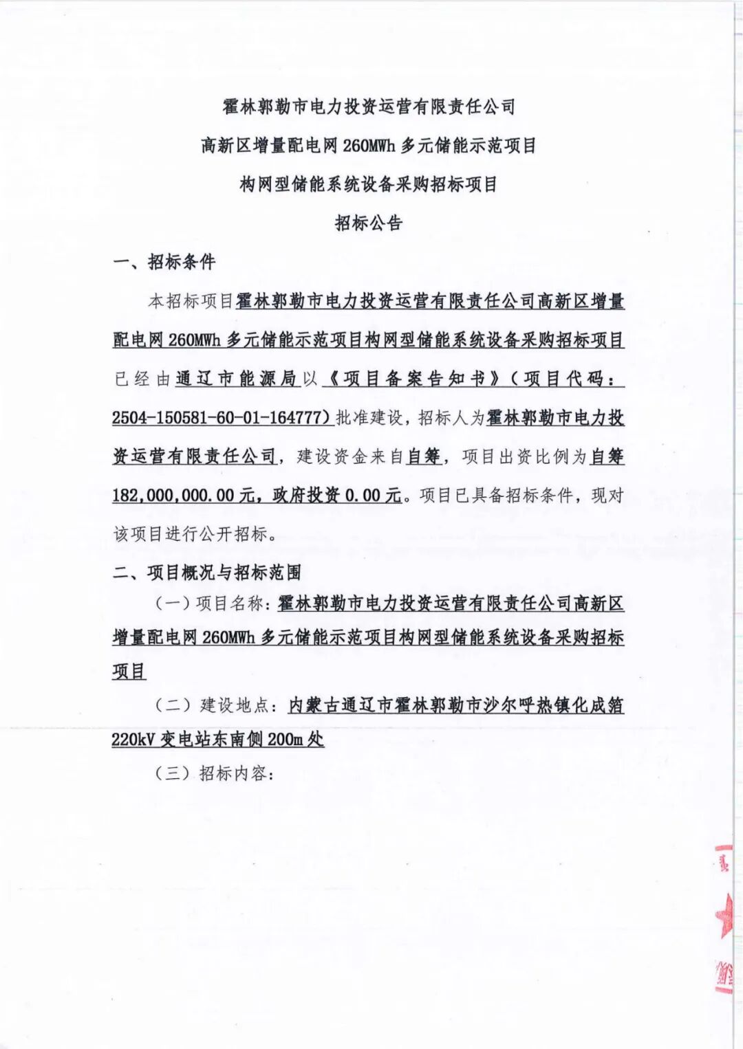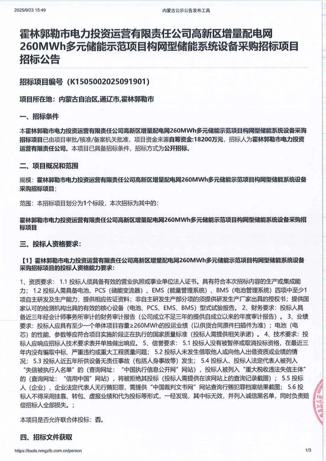 能源圈获悉,9月23日,霍林郭勒市电力投资运营有限责任公司高新区增量配电网260mwh多元储能示范项目构网型储能系统设备采购招标项目招标公告发布。