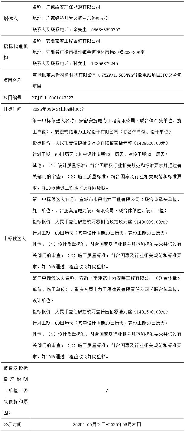 9月24日,宣城顺宝莱新材料科技有限公司0.75mw/1.566mwh储能电站项目epc总承包项目中标候选人公示。