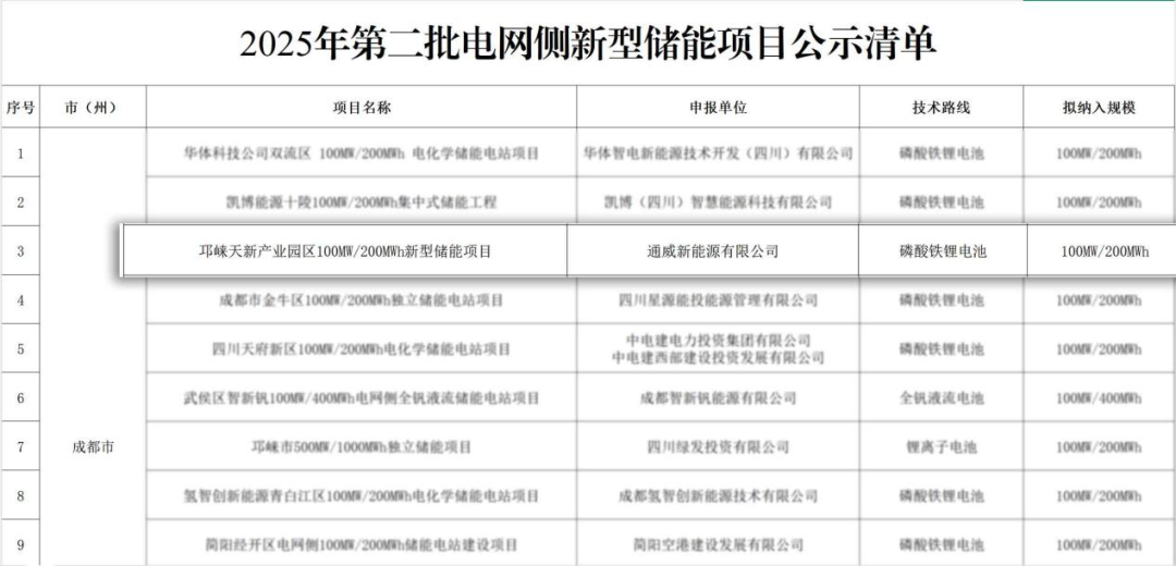 近日,四川省发改委发布的2025年第二批电网侧新型储能项目清单正式完成公示,通威新能源申报的邛崃天新产业园区100mw/200mwh新型储能项目成功获批,献礼通威43年庆。这是继今年5月金堂独立共享储能电站获批后,通威新能源在电网侧储能领域的又一突破,充分彰显通威新能源在积极响应国家能源战略、助力新型电力系统构建方面的实干成效。