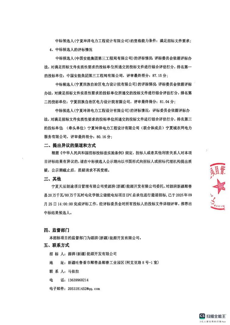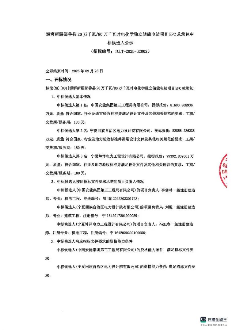 能源圈获悉,9月26日,源湃新疆鄯善县20万千瓦/80万千瓦时电化学独立储能电站项目epc总承包中标候选人公示。项目招标人为源湃(新疆)能源开发有限公司,项目位于新疆吐鲁番是鄯善县。